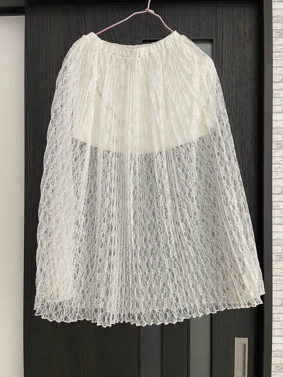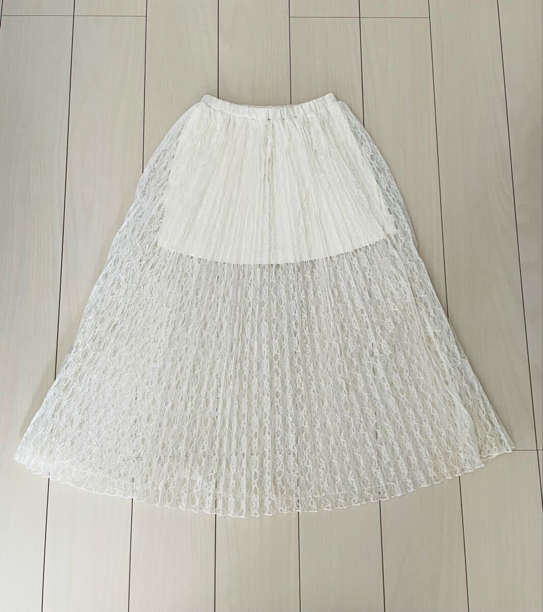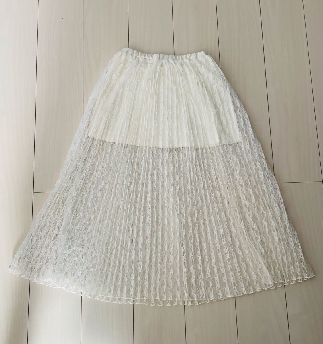 レース素材のプリーツロングスカートです。上の方だけ裏地付きで透け感がございますウエストはゴム仕様で着心地も良いです。