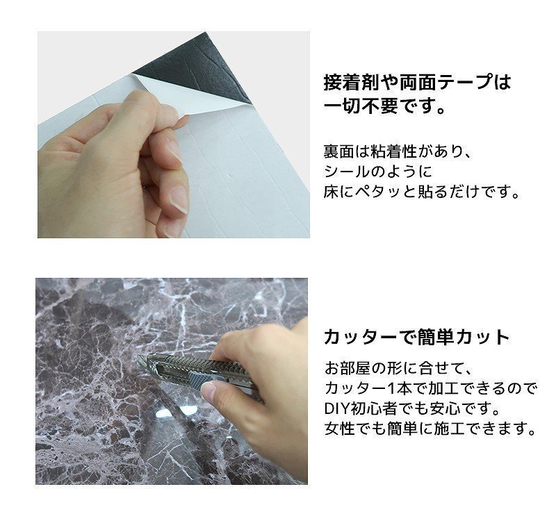 ![]() 自分で出来る、簡単リノベーション! 貼るだけカンタン!のシール式フロアタイルシートです。 床の色やデザインが違うだけで雰囲気はガラリと変わります。 汚れの付きやすいキッチンや洗面所、 経年劣化などによるフローリングのキズや変色が気になる・・・ そういったお悩みを解決できるのがこの「フロアタイル」です。 毎日過ごすお部屋の床を低コストでリフォーム・模様替え出来ます♪ ■まるで本物の様なリアルな質感&デザイン! 細かい凹凸や模様の具合など、素材感にこだわって作られており、 リアルな質感なので安っぽさも感じさせず、手軽に高級感を演出。 ■裏面は粘着性があるので、接着剤なしで施工可能。 シートをはがして貼るだけ! ■カッターで簡単にカット! お部屋の形に合わせてカッターやハサミで簡単に加工できるので、 DIY初心者や女性でも簡単に施工できます。 ■圧倒的低コスト! フローリングの修繕やリフォームには膨大な費用かかってしまいます。 ですがこちらの貼るだけタイプのフロアタイルなら 「低コスト」でお部屋の雰囲気を変えられます! ※画像一枚目の丸窓部分に映しているのが 実物の商品の写真、色味になりますのでご参考ください。 ・1枚あたりのサイズ(約):高さ300mm×幅300m 厚み:2mm ・材質:PVC |