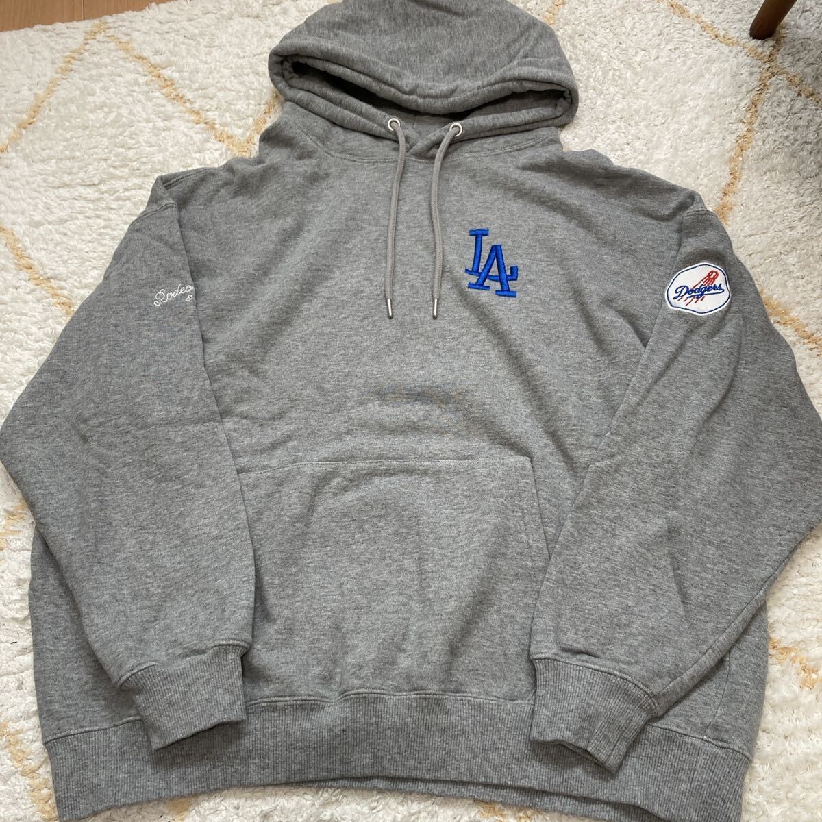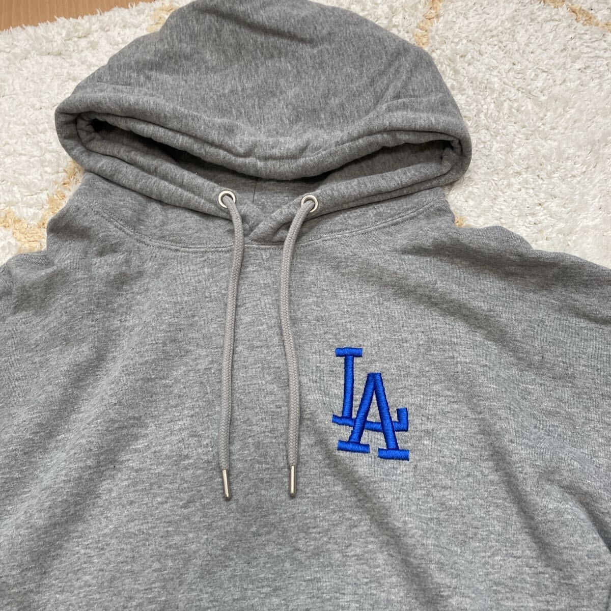 ロサンゼルス・ドジャースの刺繍が施されたグレーのフード付きパーカーです。