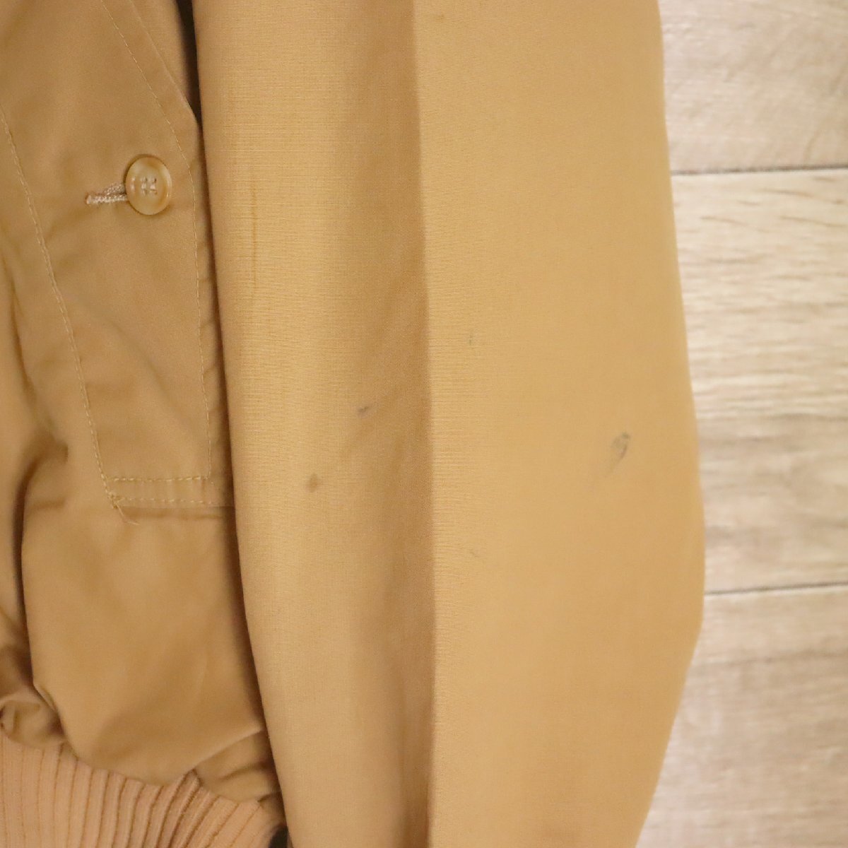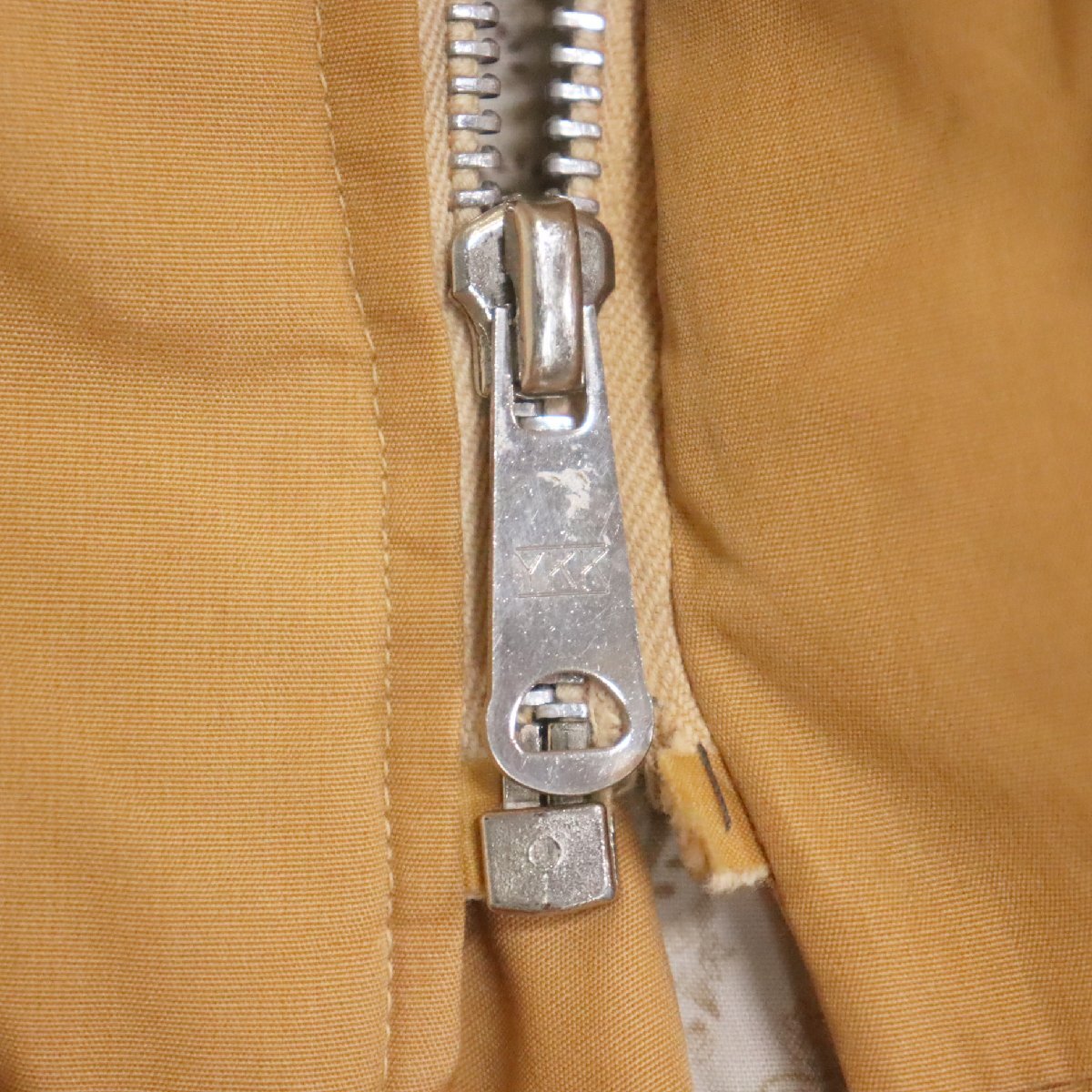 中古品です。使用感があります。写真にあるように各部に薄汚れ、ジップの差し込み部分に裂け、襟吊りが切れています。