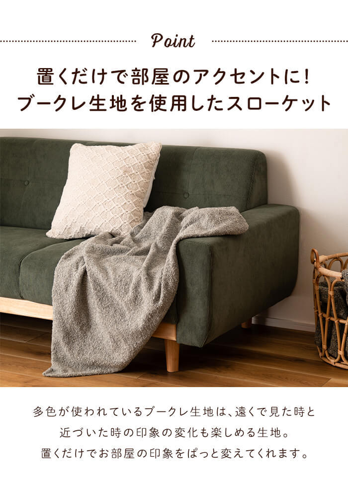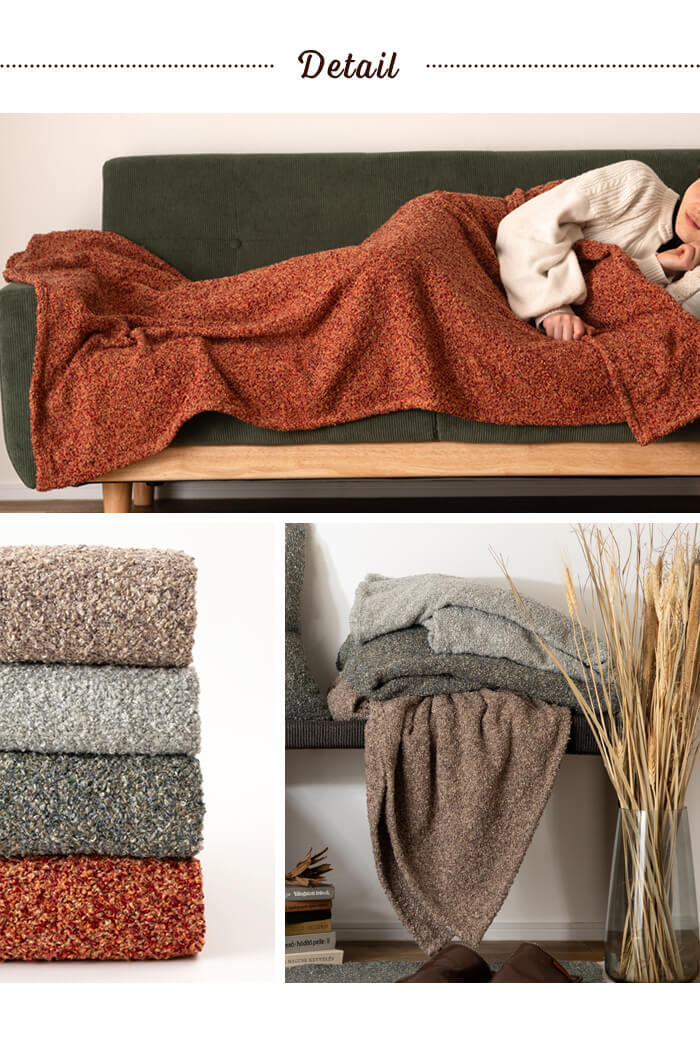 | トレンドのブークレ生地を使用したスローケット。 130×170cmの大判サイズで使い勝手も良く、さっと掛けておくだけでサマになるアイテム。 ひざ掛けやお昼寝の時にも活躍します。 混色のブークレ生地を使うことで、絶妙なニュアンスが引き立つ大人っぽい仕上がりに。 【ブークレ生地とは】 ブークレはフランス語で「輪」という意味で、その名の通り表面に糸の輪っかが出るように加工された生地です。 モコモコとした素材感と独特な柔らかさが魅力のブークレ生地は、フェミニンで暖かな印象を感じさせます。 |