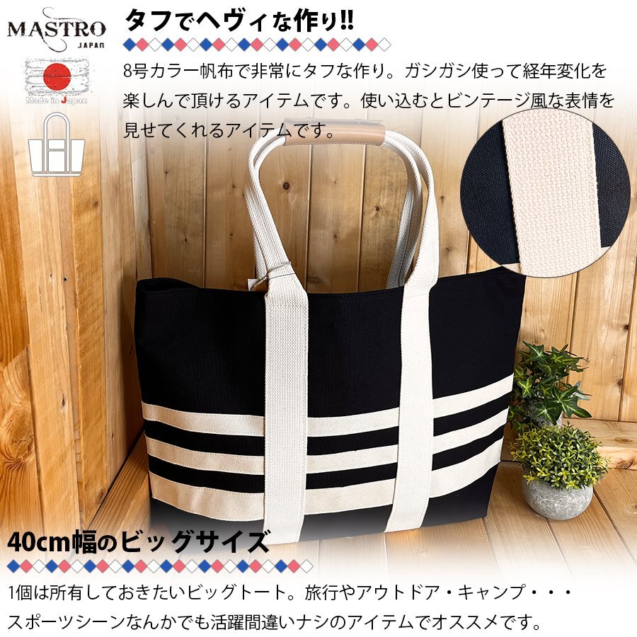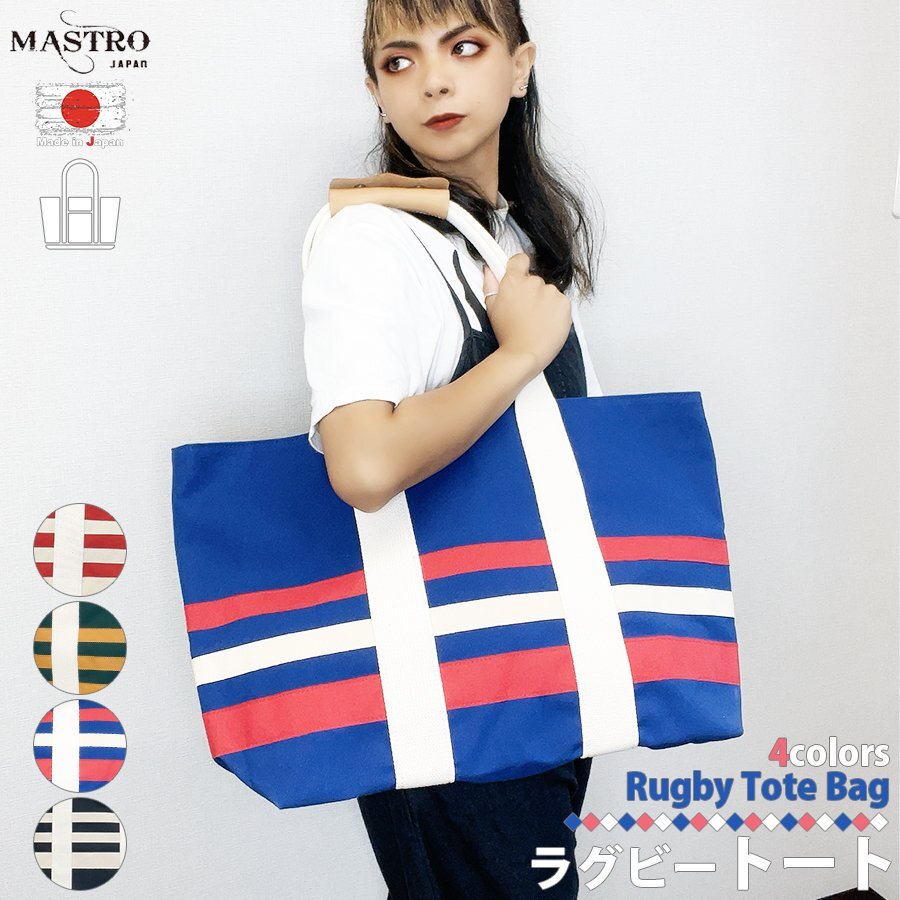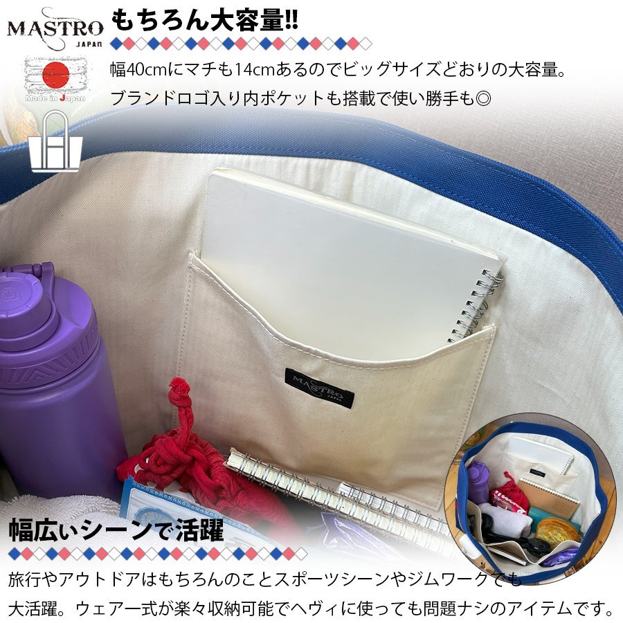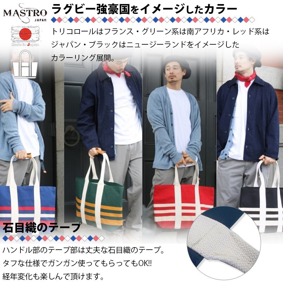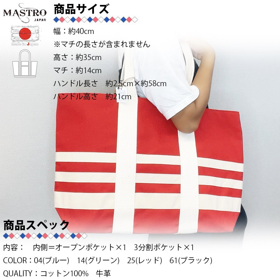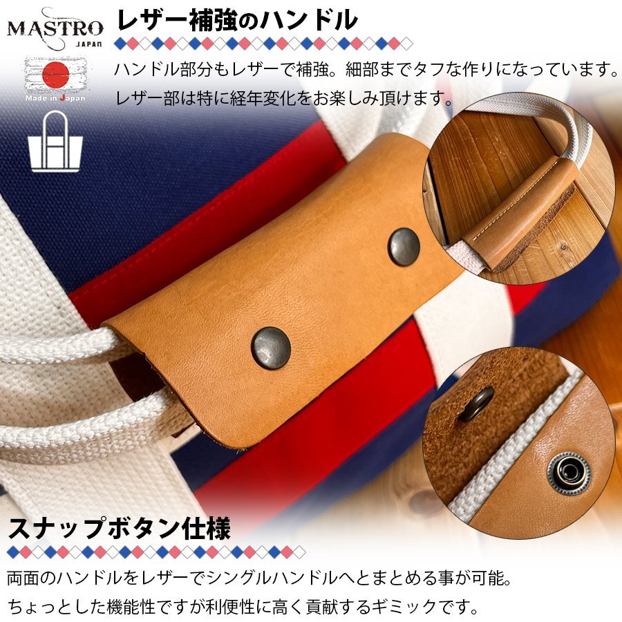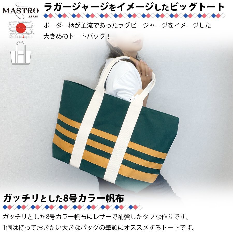 | 商品名:MASTRO キャンバスラグビートート 素材:コットン100% 牛革 サイズ:幅約40cm・高さ35cm・マチ14cm・ハンドル長さ約2.5cm×約58cm・ハンドル高さ約21cm 内容:内側=オープンポケット×1・3分割ポケット×1 生産国:日本製 |