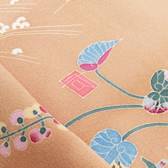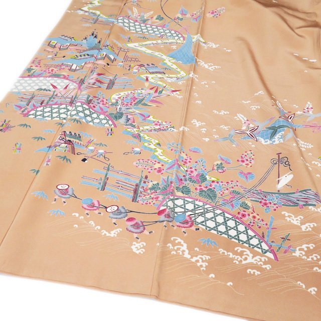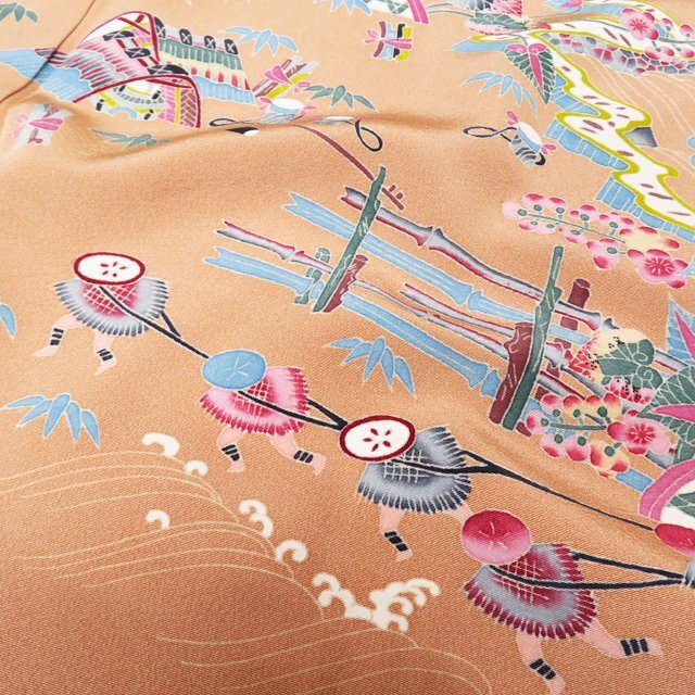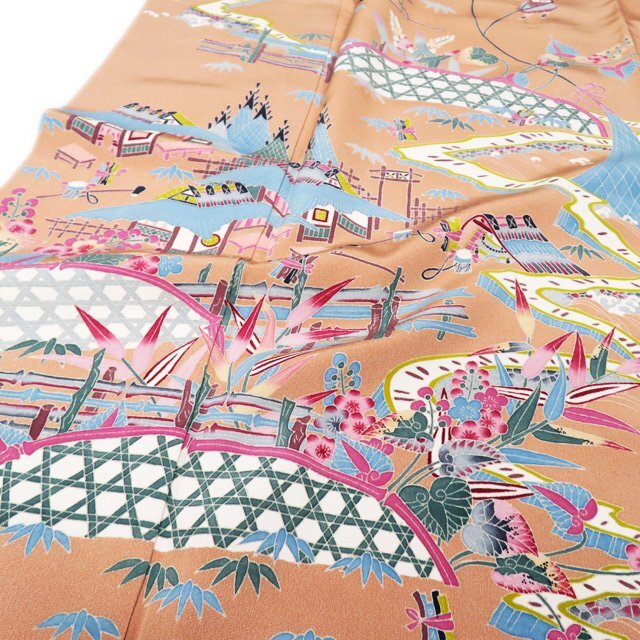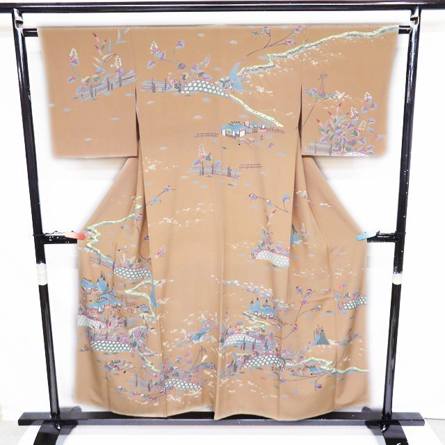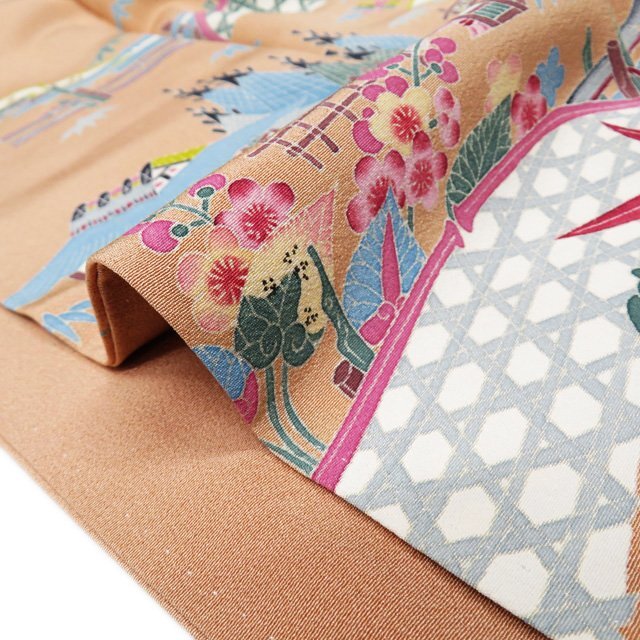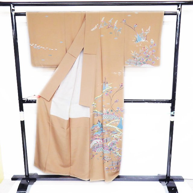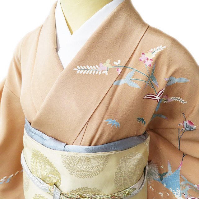 丈154cm(+16) 裄63cm(+3.5) 袖丈46cm(+4) 前幅25cm 後幅30cm ※サイズのお直し、承ります。 (身丈のみ、身幅のみのお直しは承っておりません) ※身丈は肩から測っております。 ※()内はおおよそのお直しいただける長さです。胴裏の長さ等によって()内の長さ通りお直しできない場合があります。 単位:cm 素材 正絹 商品ランク C ●着用時期 10~5月(+-2週間) ●着用シーン 披露宴、パーティー、お出掛け、式典など ●お色 淡香色 多色 加賀友禅は加賀御国染の色絵・色絵紋を基礎として発展した染色技法といわれており、落ち着きのある写実的な草花模様を中心とした絵画調の柄が特徴です。 加賀五彩(藍・臙脂・黄土・草・古代紫)による豊かな色彩表現は美しい着姿を演出してくれます。 是非お手元にてご堪能くださいませ。 左前身に点シミ、左襟にごく薄いシミがございますが、まだまだご着用いただけるお品物です。 写真に写っている着物のみの販売で帯等の付属品はついておりません。 一部商品は実店舗・他サイトでも並行して販売しておりますので売り切れの際はご了承ください。 その他多数販売中 de- | ||||||