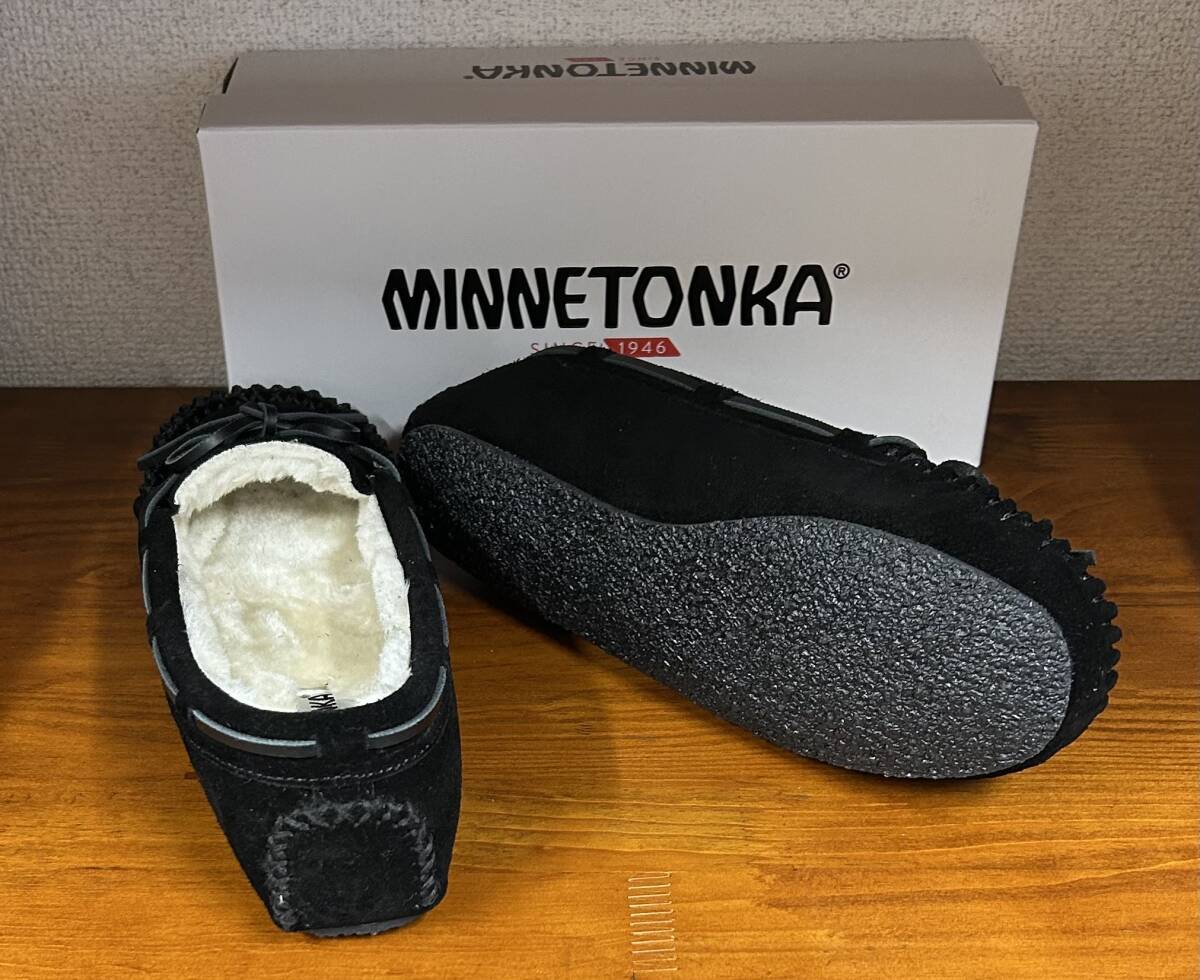 新品☆ミネトンカの高級スエード本革製ムートンモカシン★黒★US8★24.5㎝