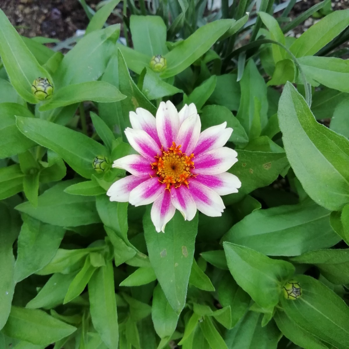 花径:約6cm。白色の花の中心に濃ピンク色の花が夏から秋まで咲き続けます。