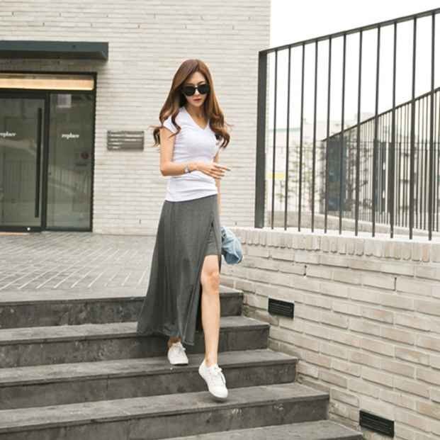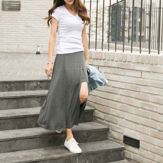 ・女性らしいフィット感のあるシルエットのロングスカート。深めにスリットが入って大人の着こなしができます。