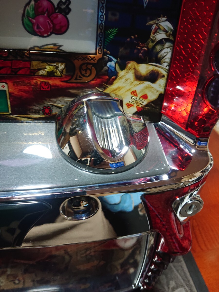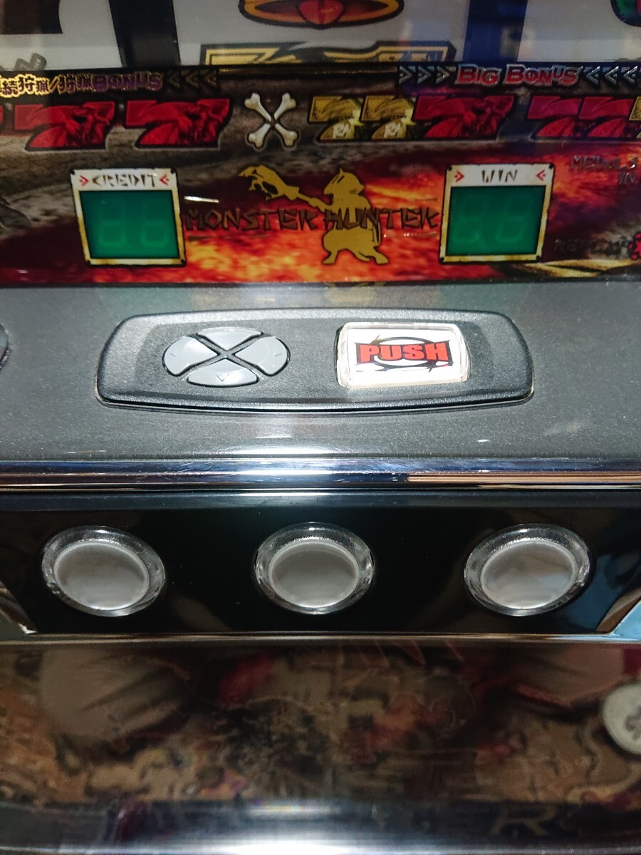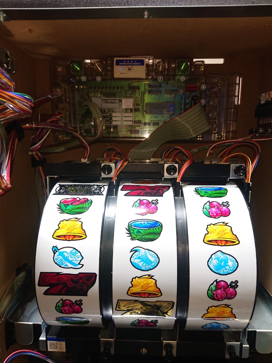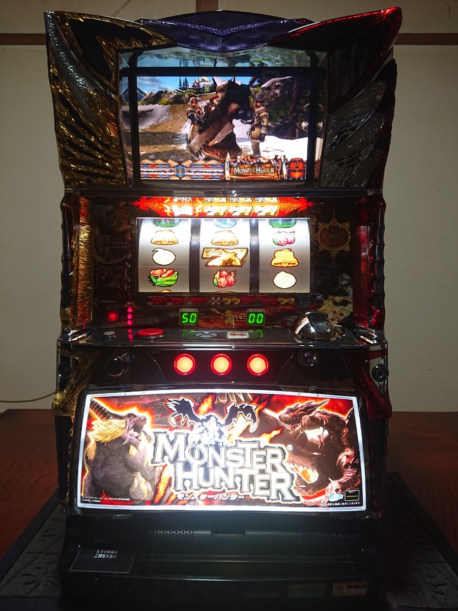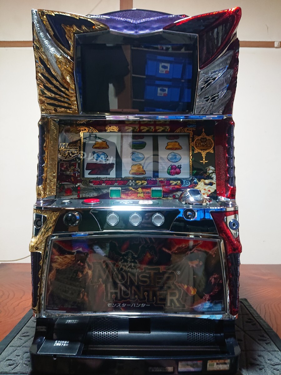 パチスロ実機、初代モンスターハンターです。動作確認済みで、リールの回転、液晶の表示、ボリューム調整、設定の変更、ボーナス消化等、問題なく動作致しました。家庭用100V電源対応のコイン不要機付きです。無段階ボリュームは付いています。現状、パネルランプ、リールランプ、キャパシタも問題ありませんでした。台鍵、設定キーは付属致します。配送は福山通運でお送り致します。自宅は福岡県の三潴郡です。御都合宜しければ、自宅お引き取りでも大丈夫です。