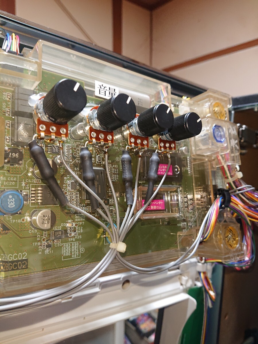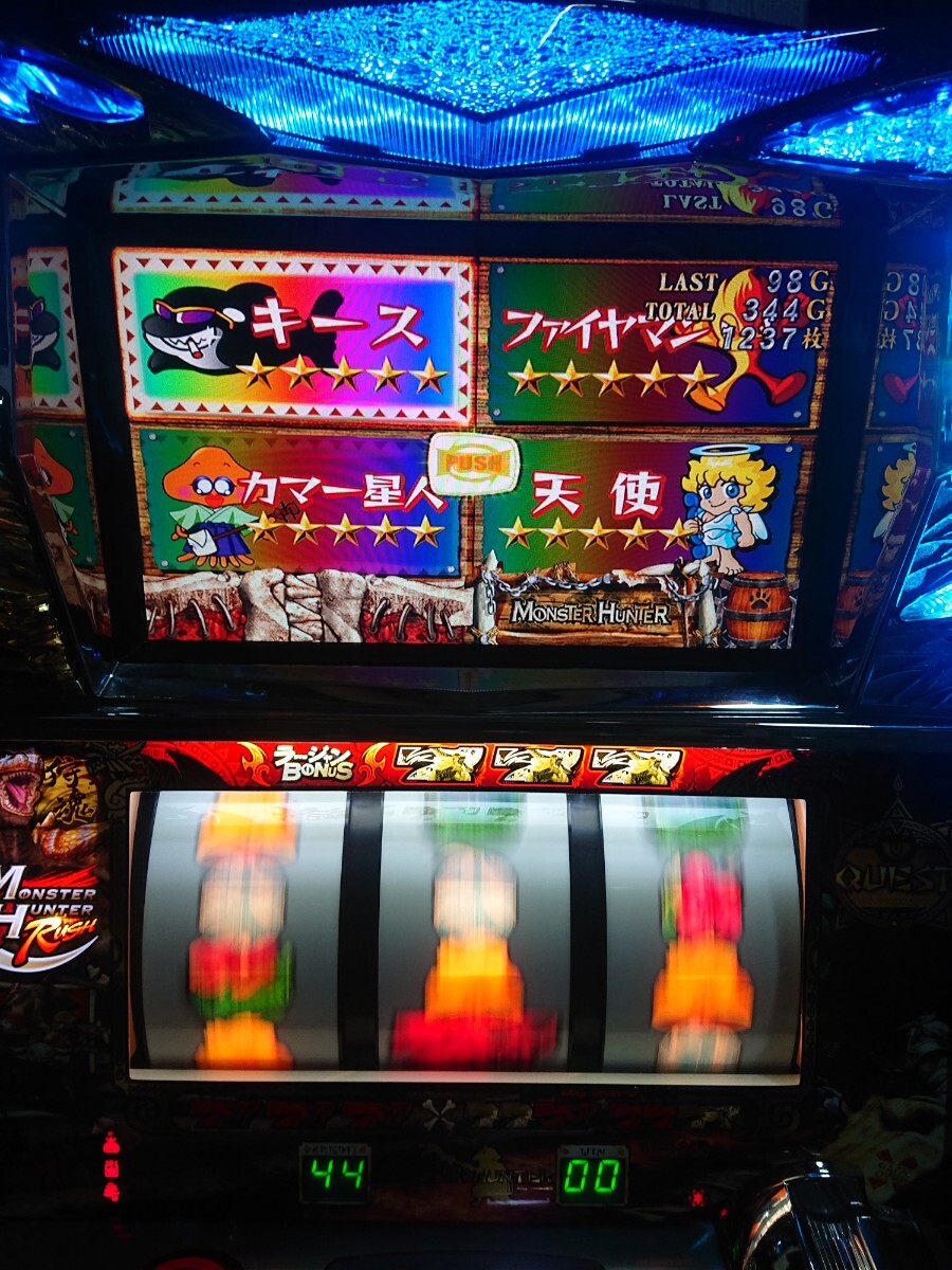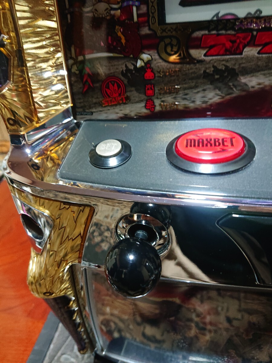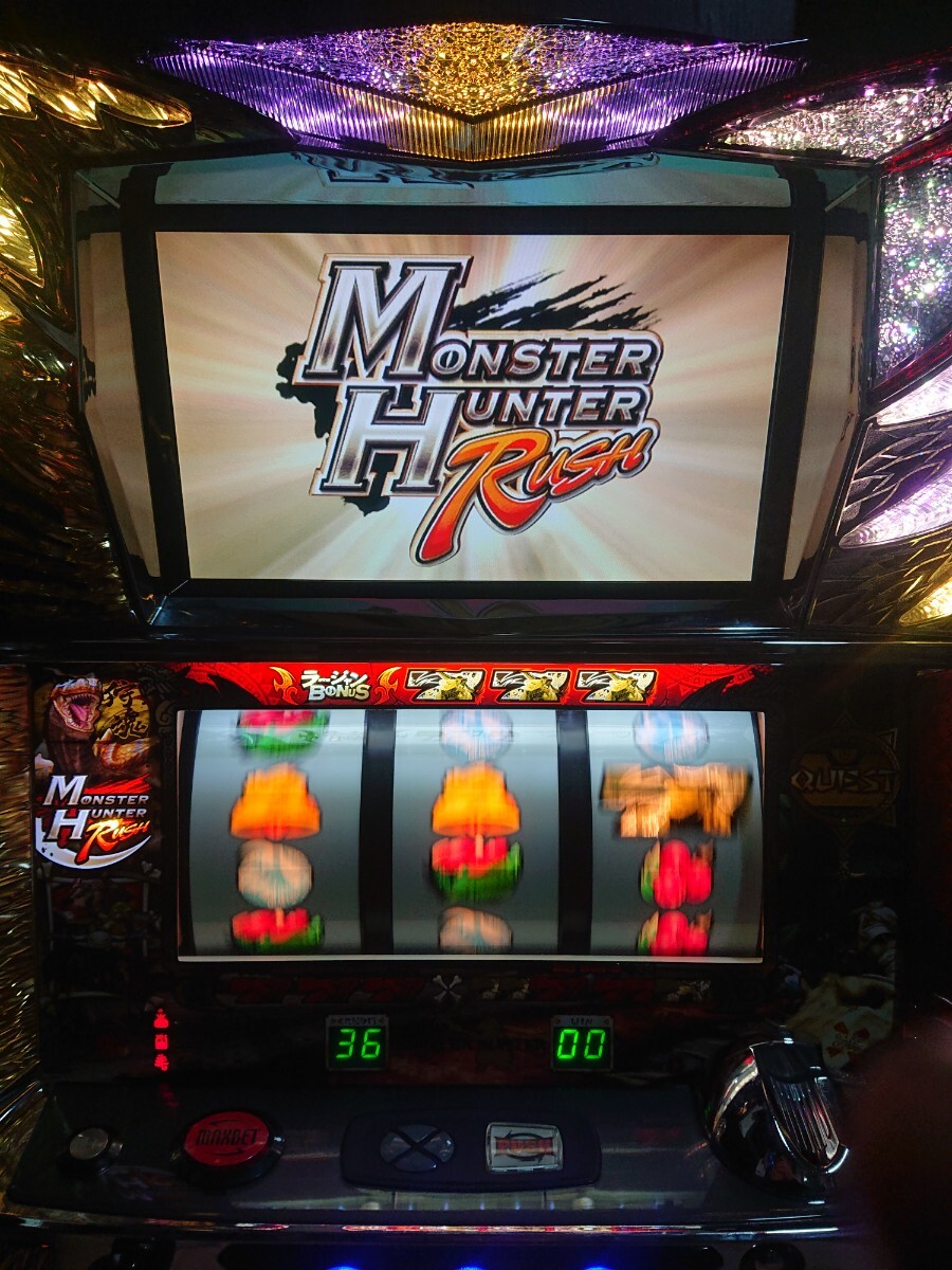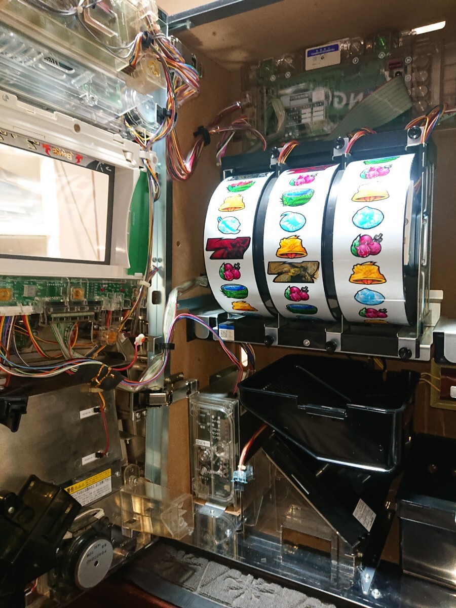 パチスロ実機、初代モンスターハンターです。動作確認済みで、リールの回転、液晶の表示、ボリューム調整、設定の変更、ボーナス消化等、問題なく動作致しました。家庭用100V電源対応のコイン不要機付きです。無段階ボリュームは付いています。現状、パネルランプ、リールランプ、キャパシタも問題ありませんでした。台鍵、設定キーは付属致します。配送は福山通運でお送り致します。自宅は福岡県の三潴郡です。御都合宜しければ、自宅お引き取りでも大丈夫です。