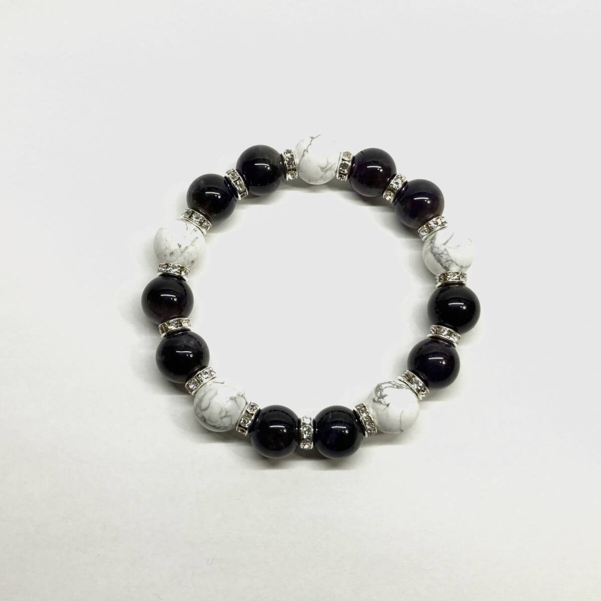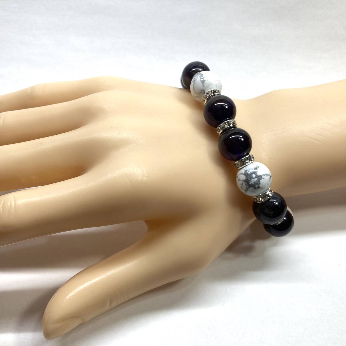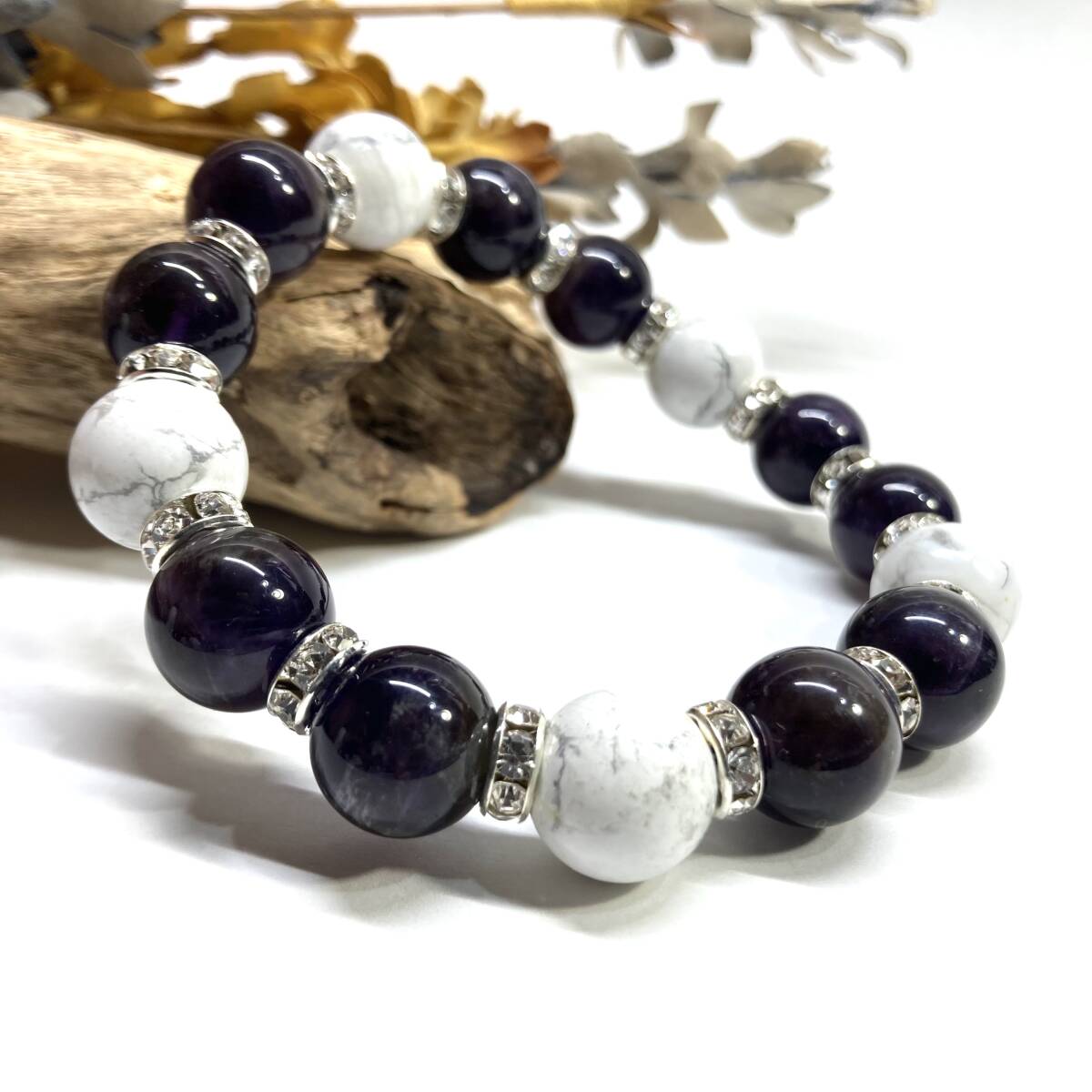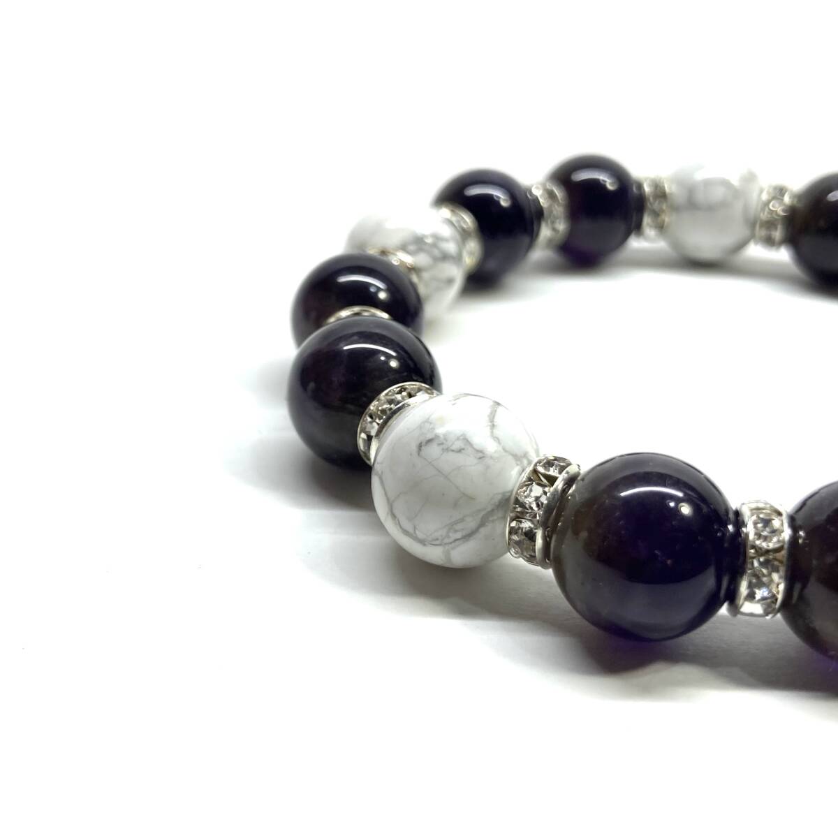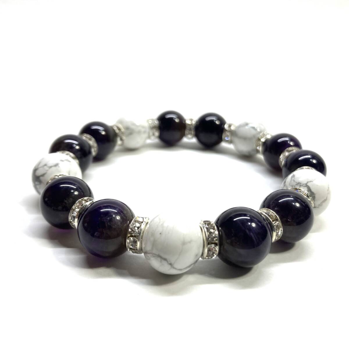 こちらは、アメジストとハウライトを組み合わせたパワーストーンブレスレットです。間にはロンデルを挟み高級感あるデザインに仕上げております。程よくインパクトがある12mm玉を使用して内周約18cmです。(サイズ変更の場合は取引ナビにてご連絡をお願いします。) 数に限りがございますので気になる方はお早めにどうぞ。