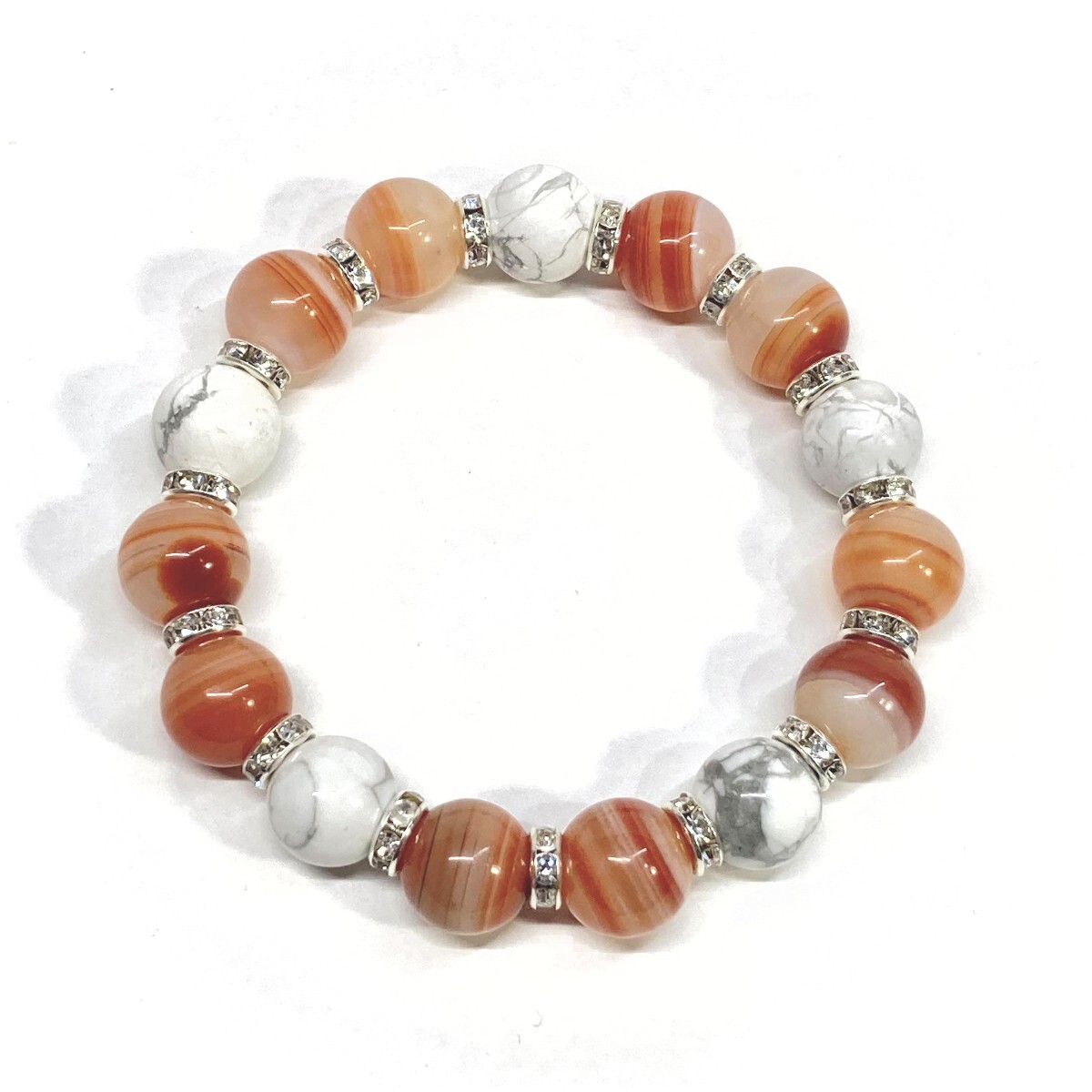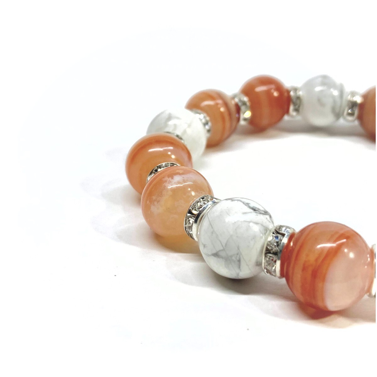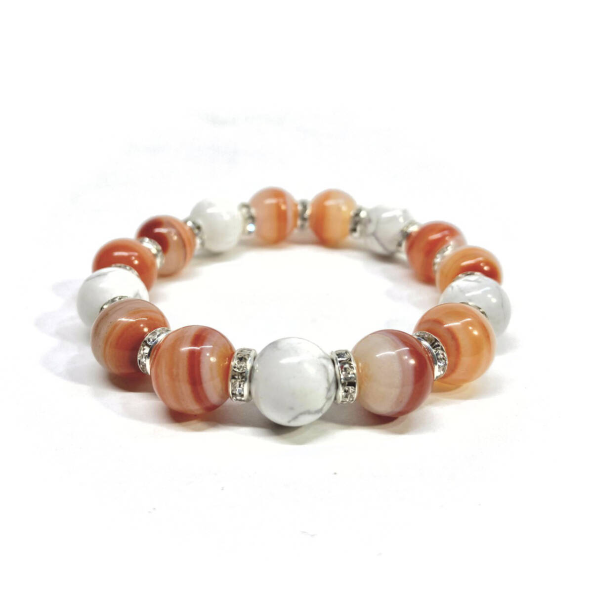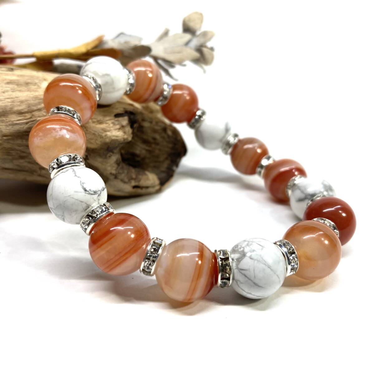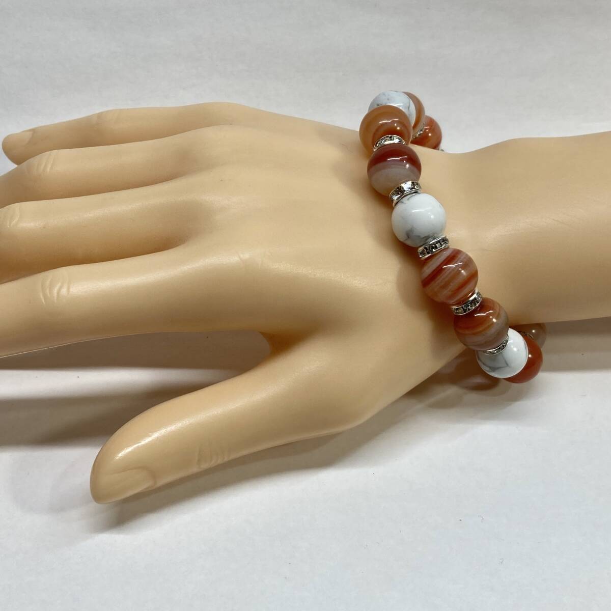 こちらは、12mm玉のカーネリアン・サードニクス(サードオニキス)とハウライトを組み合わせたパワーストーンブレスレットです。間にはロンデルを挟み高級感あるデザインに仕上げております。石大きさは12mm玉を使用して内径約18cmです。気になる方は是非この機会にどうぞ。