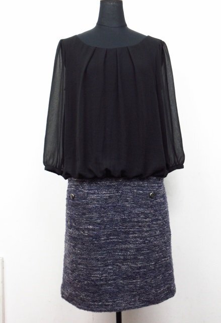 上半身は薄手で透け感のあるスリーブ、下半身はニットスカートを組み合わせたドッキングデザイン。