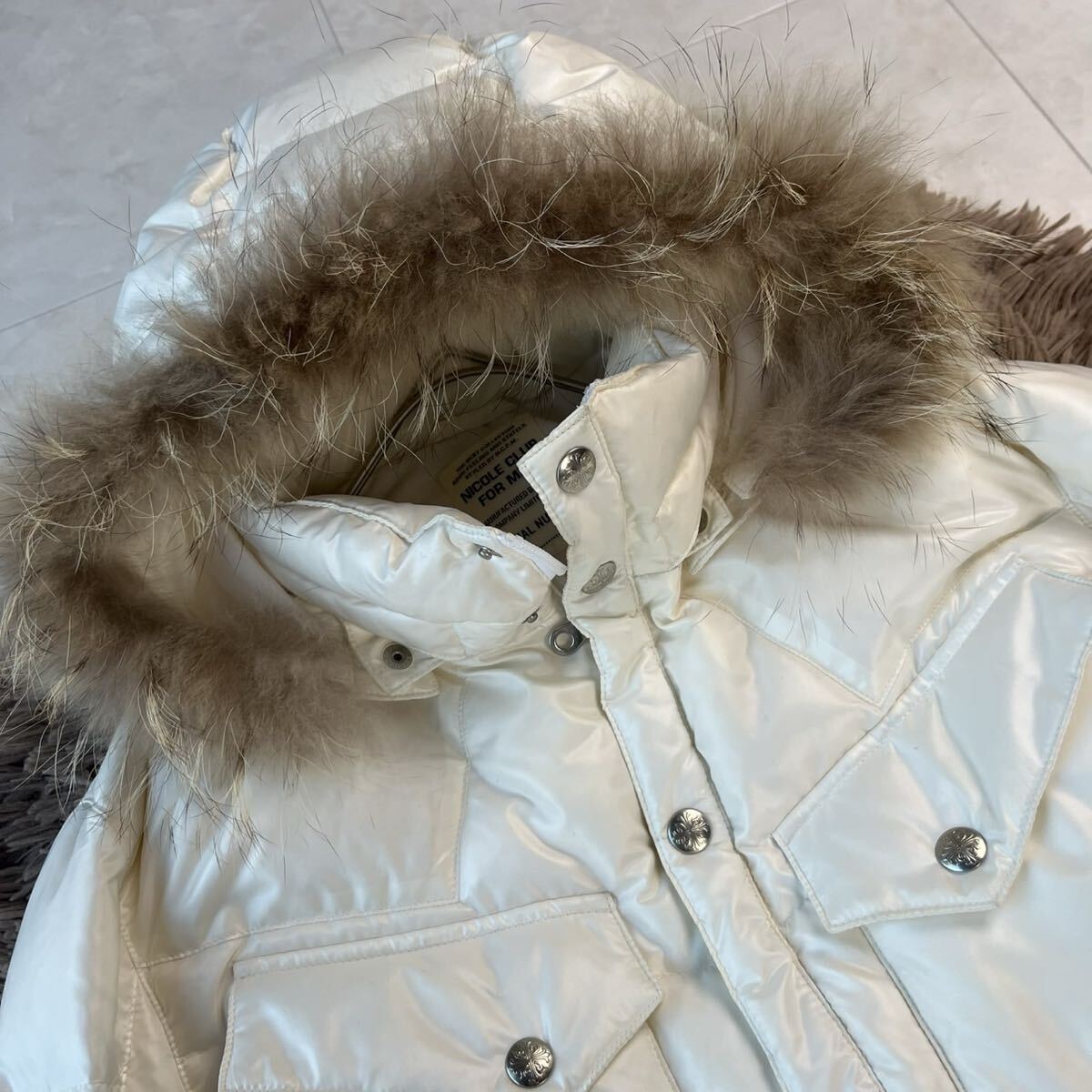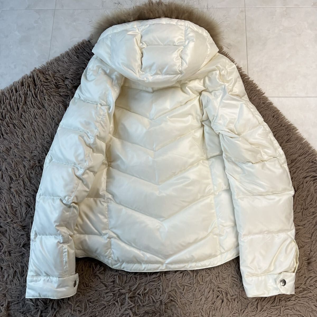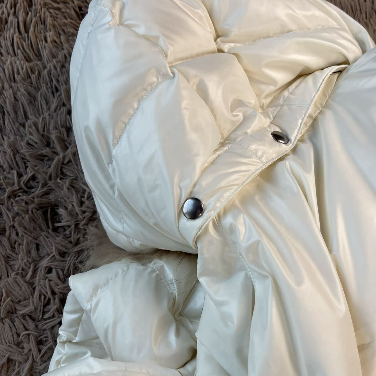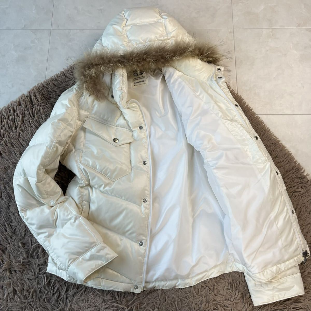 上品な光沢のあるホワイトカラーに、ラグジュアリーなラクーンファー付きフードの3WAY仕様が魅力。フード・ファーともに脱着可能で、着こなしや気分に応じたアレンジが可能です。