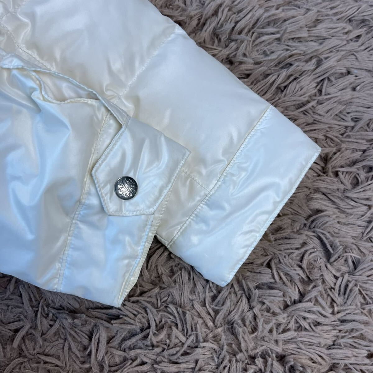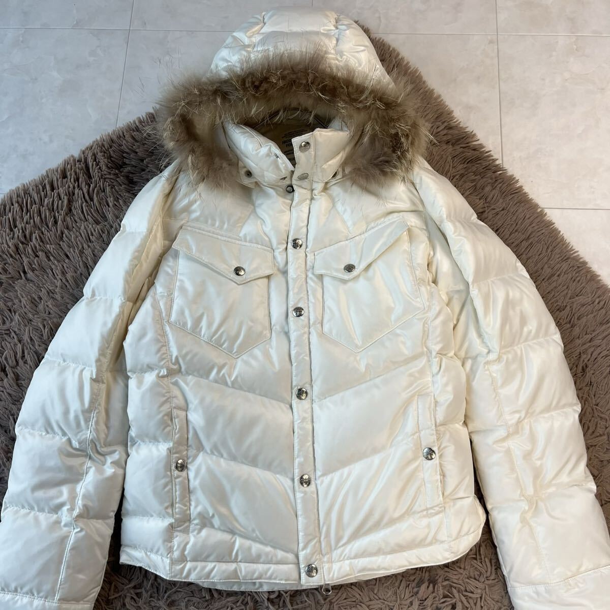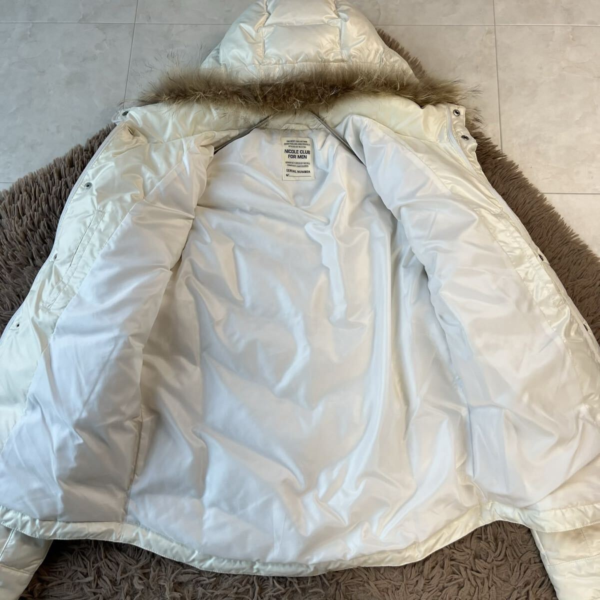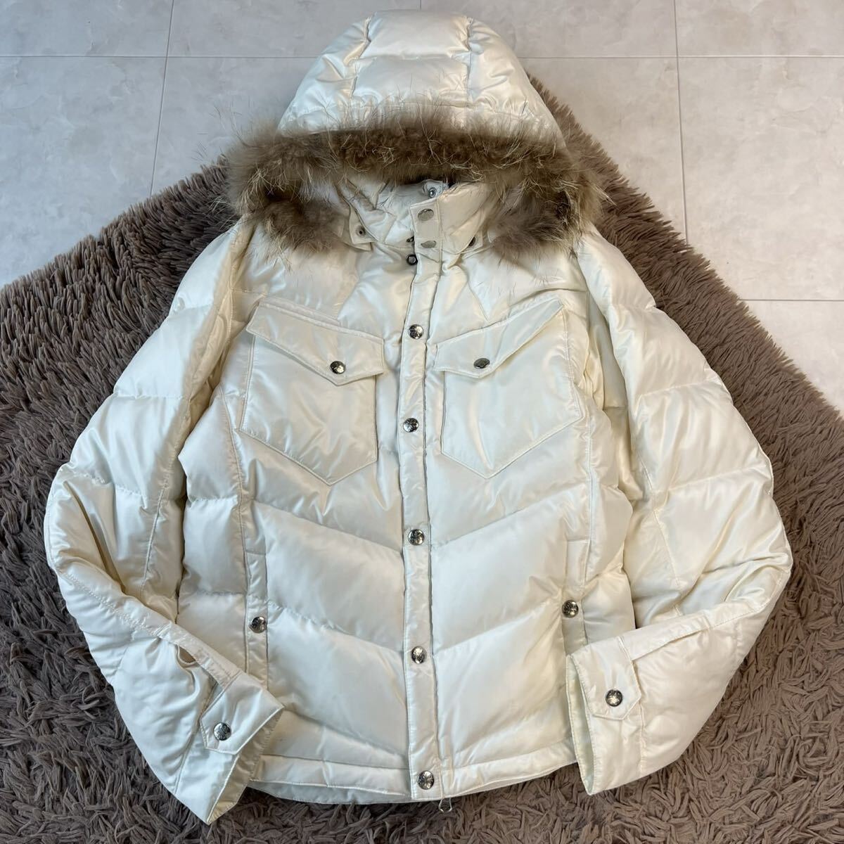 上品な光沢のあるホワイトカラーに、ラグジュアリーなラクーンファー付きフードの3WAY仕様が魅力。フード・ファーともに脱着可能で、着こなしや気分に応じたアレンジが可能です。