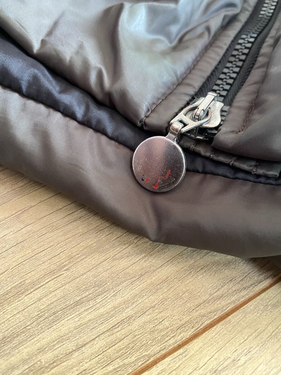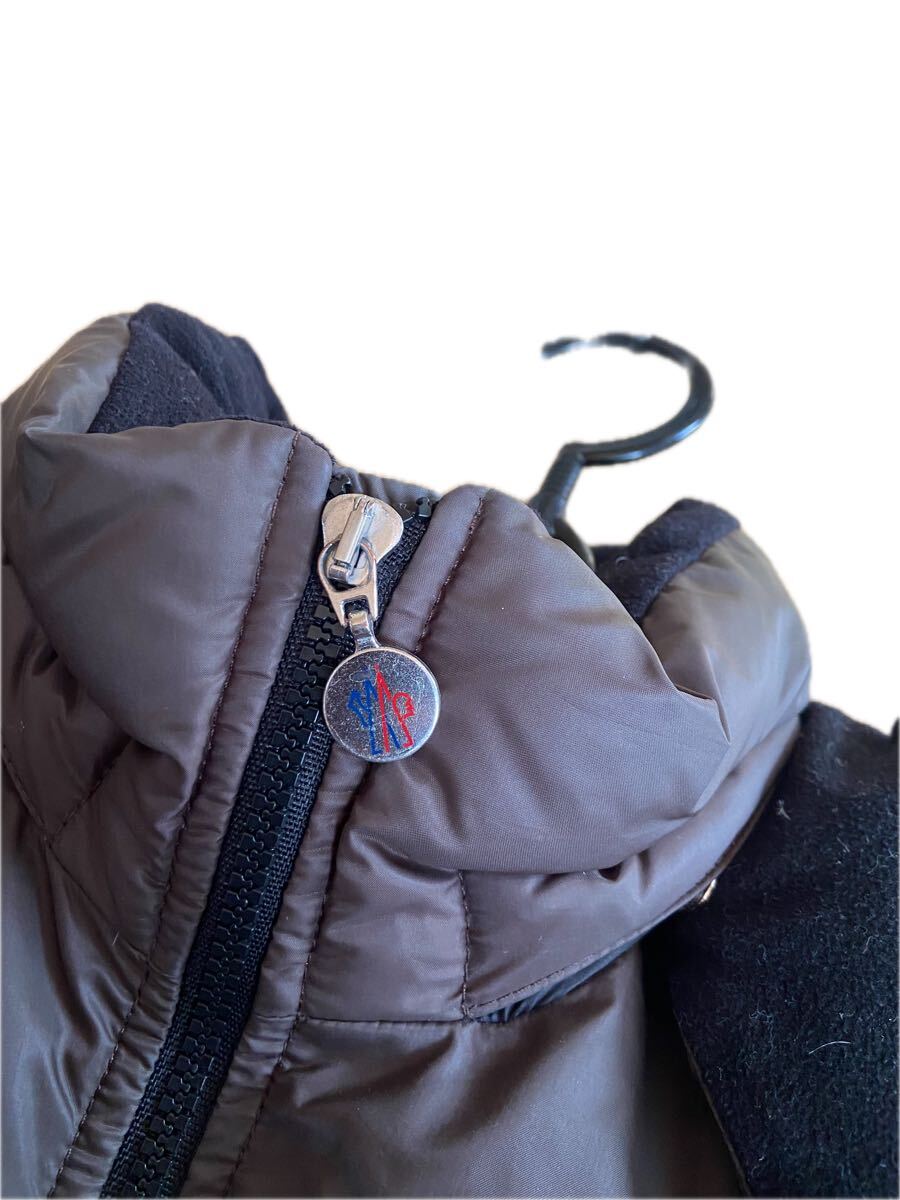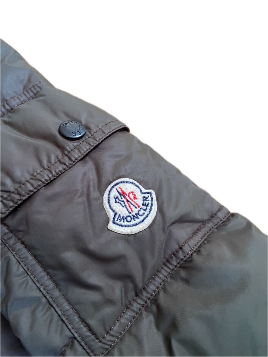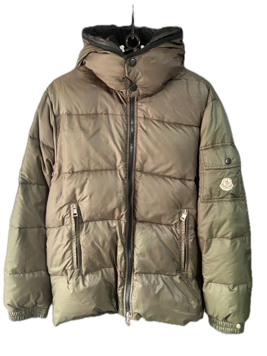 MONCLERのダウンジャケット、カラーはカーキです。フードは取り外し可能です。