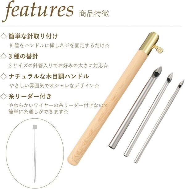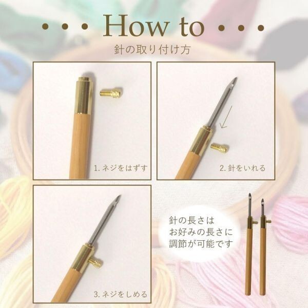 【3種の替え針入り】 細針、中針、太針の3本が入っており 作業に合わせて太さを変えられるので 色々なデザインを楽しむことができます。