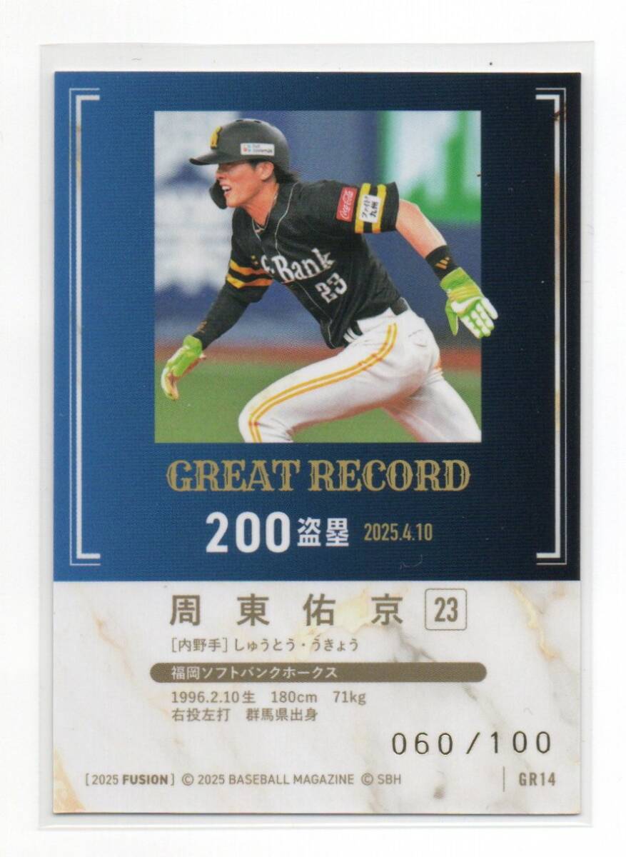2025 BBM FUSION ベースボールカードシリーズ、カードNo.GR14 GREAT RECORDインサートカード「周東佑京」選手、