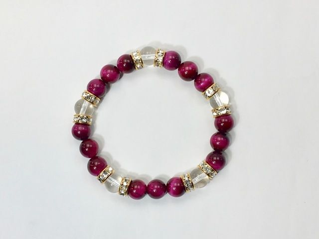こちらは、8mm玉のピンクタイガーアイと水晶を使ったパワーストーンブレスレットです。シンプルなデザインでどんなコーディネートにも合わせやすいデザインに仕上げています。サイズは内周約15cmです。気になる方は是非この機会にどうぞ。