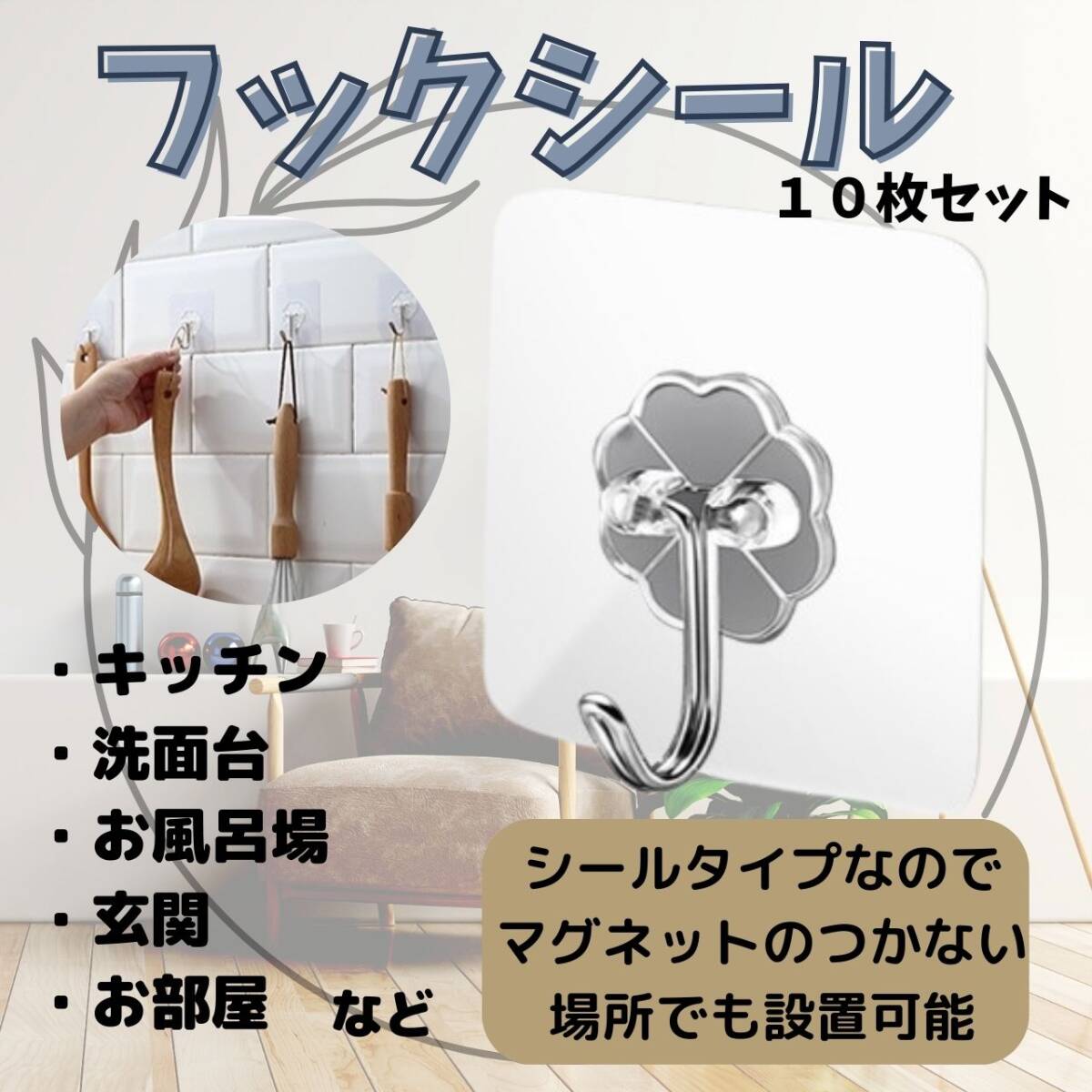 【お得!10枚セット】賃貸で壁に穴をあけられない方。重いものを掛けるとすぐにフックが落ちてしまう方。統一感のあるインテリアにしたい方。そんな方におすすめです。超強力 フックシール 10枚セット!セットで販売なのでインテリアとしても統一感を出すことが出来ます。シール部分が透明で目立ちにくいので、鏡などにもお使いいただくことが可能です!シンプルで清潔感のあるデザインなのでキッチンやお風呂場、脱衣所はもちろんシールタイプなので玄関やお部屋など使い方は無限大です。【サイズ】縦:6㎝横:6㎝