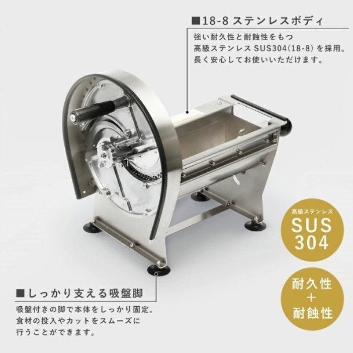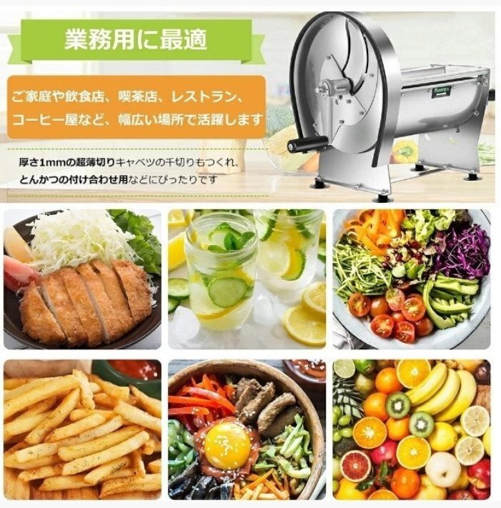 【多彩なメニューに大活躍】 じゃがいも、大根、にんじん、きゅうり、硬い野菜や果物のスライサー、千切りなどを手軽に行えます。ご家庭や飲食店、喫茶店、レストラン、コーヒー屋など、幅広い場所で活躍し、業務用に最適です。