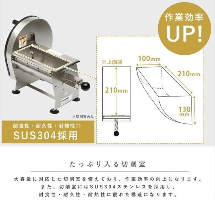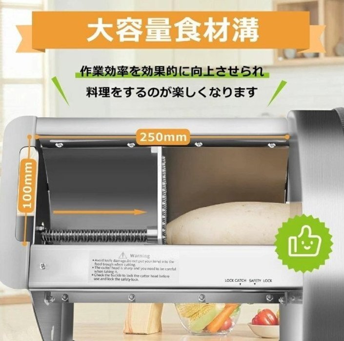 【大容量・高効率】 食材溝サイズ:250*100MM 8個レモンを入れることができます。大量のキャベツの千切りや玉ねぎのスライスは10秒以内素早く仕上がります。作業効率を効果的に向上させられます。