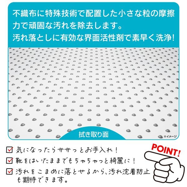 拭き取り面の粒がスニーカーの汚れを落とし、反対面で拭くことでツヤを与えます。
