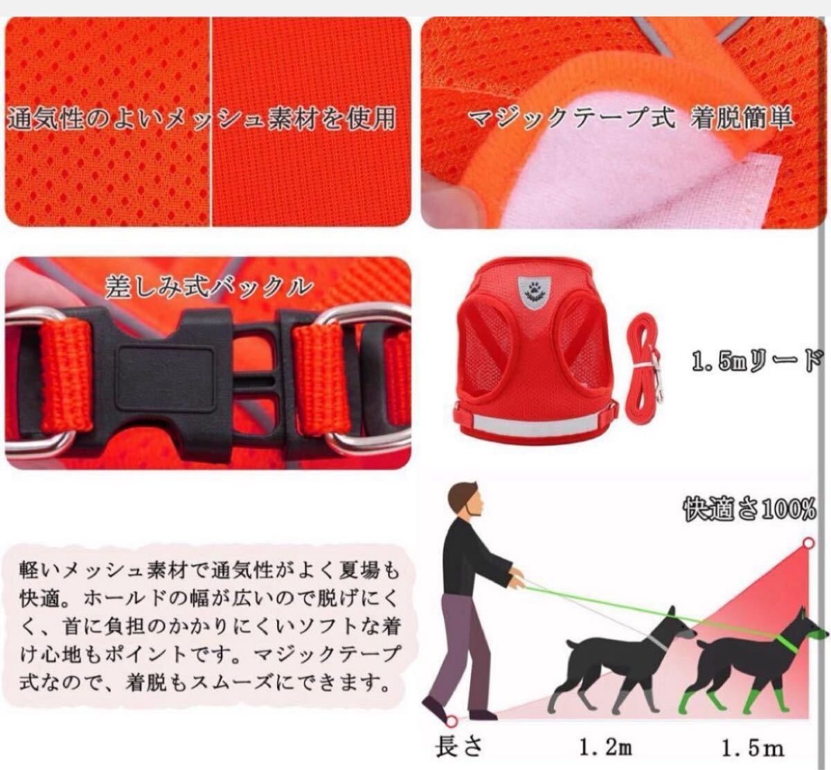 【良い通気性】 ハーネスとリードがセットになったタイプ。全体は軽いメッシュから作られ、通気性がよくなり、また犬への摩擦や負担が少なくなり、より快適に着用できます。MサイズとSサイズがございますので、サイズをご確認の上お買い求め下さい。