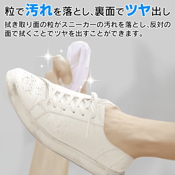 拭き取り面の粒がスニーカーの汚れを落とし、反対面で拭くことでツヤを与えます。