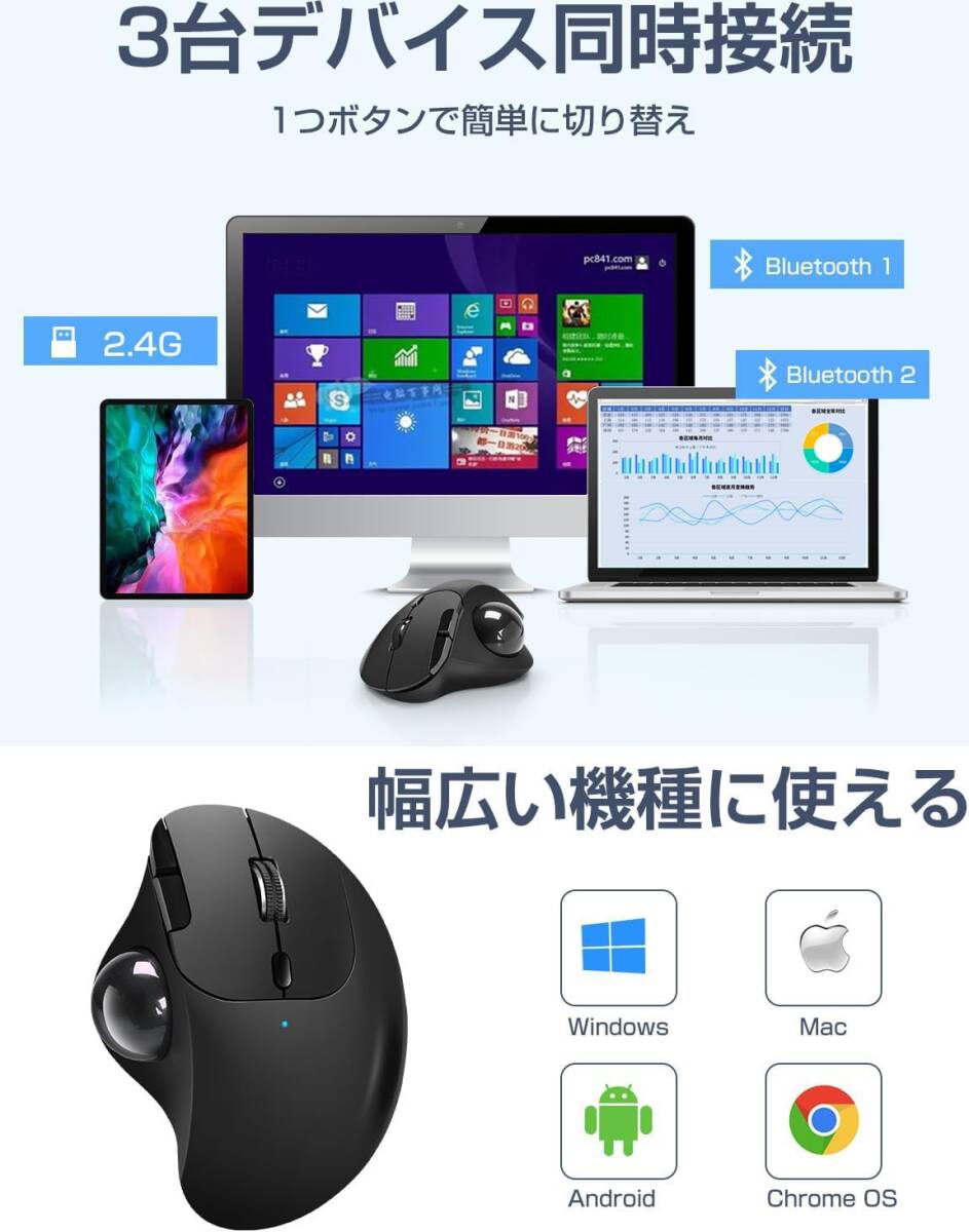 Ewin トラックボールマウス Bluetooth&2.4GHz両対応 3台同時接続 トラックボール 【NEWモデル】 ワイヤレス マウス 親指 静音タイプ 高精度 エルゴノミクス 瞬時接続 無線マウス 7ボタン 進む/戻るボタン Windows/Mac/iOS/Android多機種対応 (グレー)