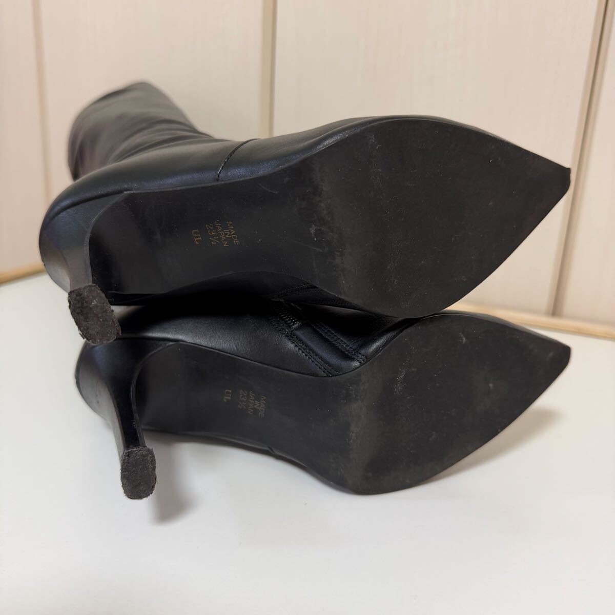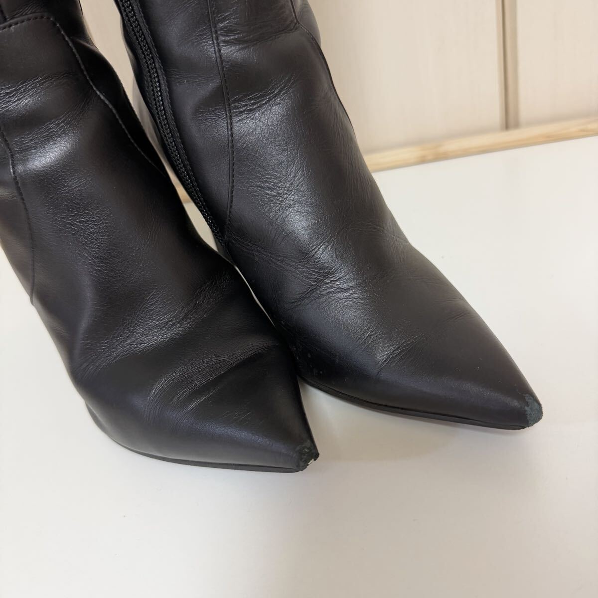使用期間としては短いですが、使用頻度が高かったため、若干の使用感が出ており、特に足首部分の履きジワがかなり目立つ状態です。またつま先に多少のキズがございます。ブーツ内は香水の匂いが少し残っております。