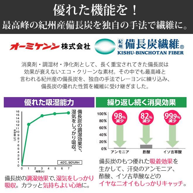 ・紀州備長炭繊維使用で、吸湿効果に加え、備長炭のもつ優れた吸着効果により、