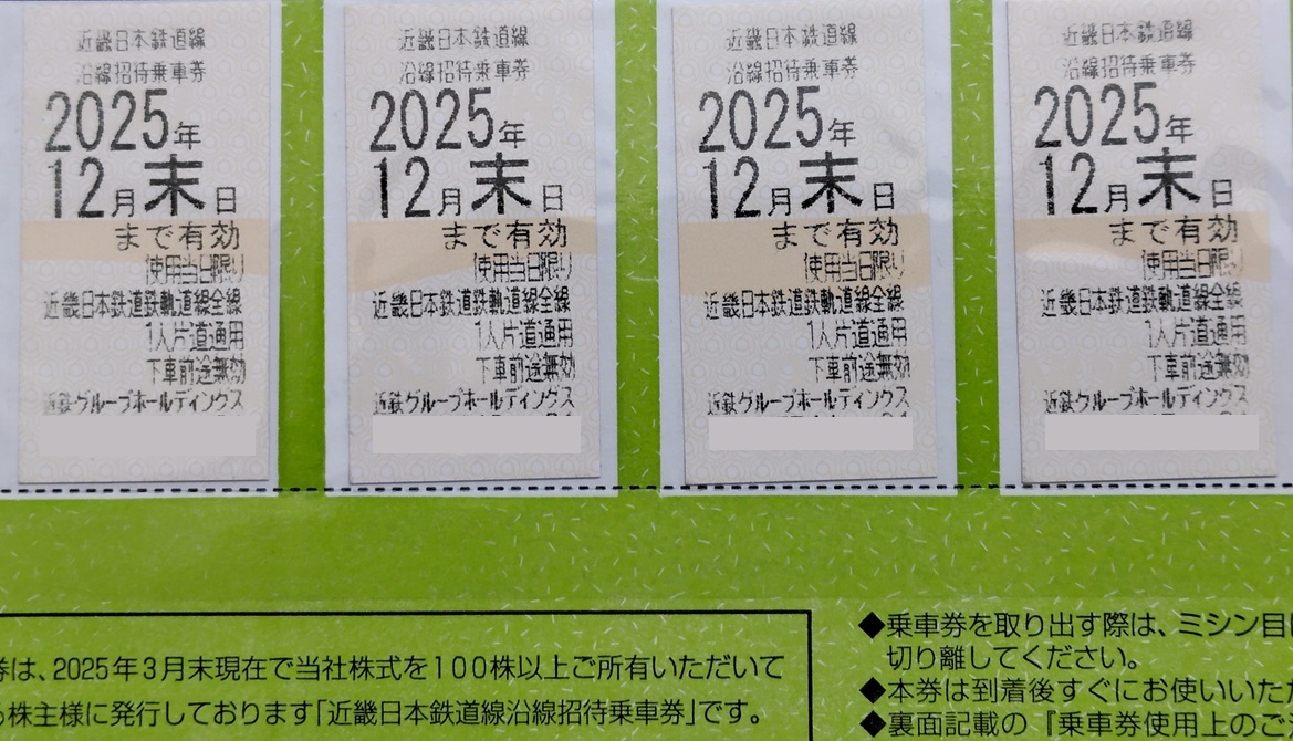 近畿日本鉄道(近鉄)の「株主優待券」(沿線招待乗車券)4枚組です。