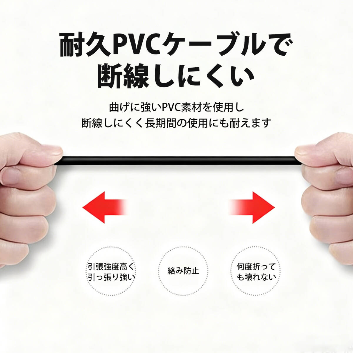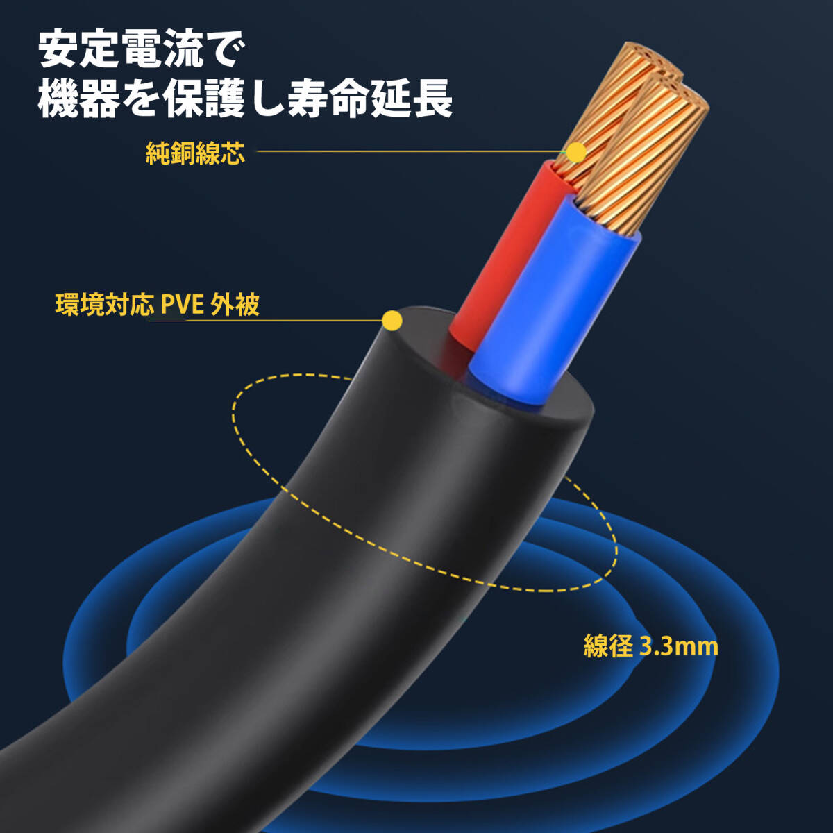 | この商品について | 【柔らかく丈夫なPVCケーブル】:柔軟なPVC素材を採用し、曲げやすく絡まりにくい設計。耐久性が高く、折り曲げや頻繁な使用にも強く、内部の線芯をしっかり保護します。収納時もコンパクトで扱いやすいのがポイントです。 【太めの銅線で安定性能】:内部には高純度の太い銅芯を使用。電流の流れがスムーズで、発熱を抑えながら安定した電力を供給。長時間の使用でも安心です。 【耐摩耗性の高いメッキコネクタ】:端子部分には高品質なニッケルメッキを採用。長期間の抜き差しにも強く、酸化を防ぎ、長寿命を実現。接触不良のリスクを軽減します。 【即挿し即使い・安定伝送】:ドライバー不要で「挿すだけ」ですぐに使える便利設計。信号伝送性能が優れており、電力を安定供給。突然の電圧変動を抑え、デバイスをしっかり守ります。 【幅広い対応機器】:ルーター、ミニスピーカー、電動シェーバー、冷却ファンなど、DC電源対応機器に幅広く使用可能。出張や旅行先でも便利に使えます。 |