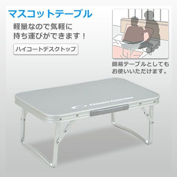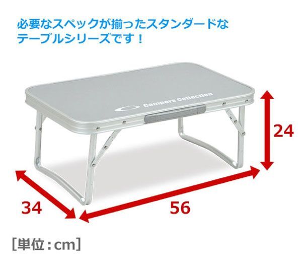 | 内 容 | ■キャンパーズコレクション マスコットテーブル(幅56奥行34) ■品番 YMT-3456 【商品仕様】 サイズ:幅56×奥行34×高さ24cm 重量:1.5kg 原産国:中国 材質:天板=合成樹脂化粧繊維板(ポリエステル)、脚部=アルミ 収納時サイズ:約幅56.5×奥行35×高さ3cm テーブル天板サイズ=幅56×奥行34cm 天板耐荷重:20kg 天板:耐熱約150℃・耐滴加工 ●使い勝手のよい必要なスペックが揃ったスタンダードなテーブルシリーズ。 ●小型・軽量なので気軽に持ち運びできます。 ●専用パーツが本体脚部との隙間を解消し横揺れを軽減。 高い安定性を実現しました。 ※化粧箱に直接伝票貼り付けての発送となります |