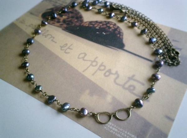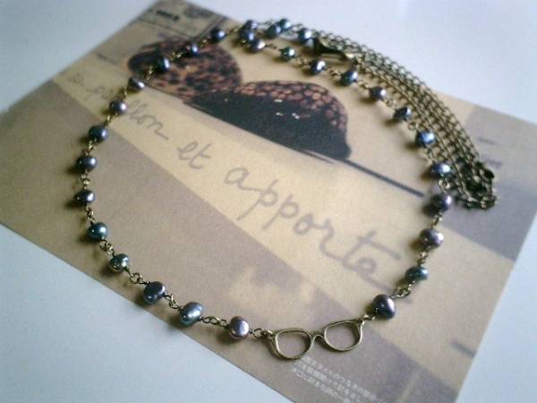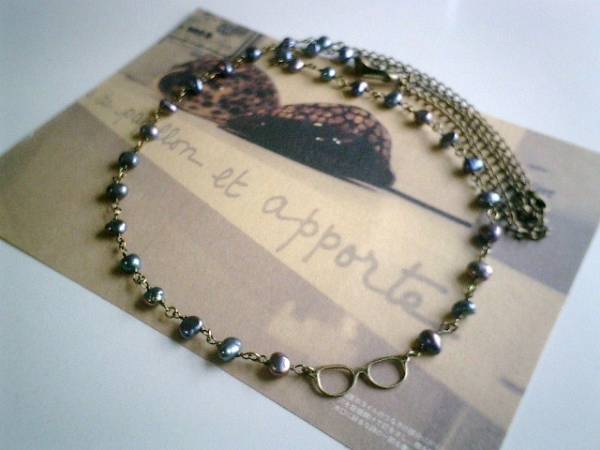 やさしい春色・・シリーズです♪小さな眼鏡の女の子・・シックなパープルグレーの淡水パールのネックレスです♪小さな眼鏡のチャームを合わせてキュートな表情です♪淡水パールは7ミリから8ミリ位のバロックです♪眼鏡のチャームは3×1センチ位です♪長さは全長95センチ位で調節自由です♪お揃いのネックレスやブレスレットも出品しています♪シンプルで飽きのこないいつまでも着けられるデザインを考えて作りました!ハンドメイドをご理解頂いてノークレーム、ノーリターンでお願いします