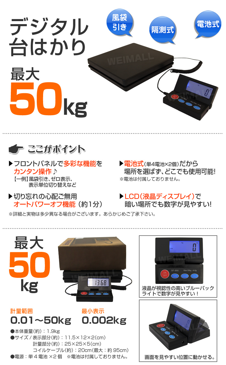 使いやすい! 家庭用デジタルスケールです。 ディスプレイユニットが本体と別で見やすい位置に設置できます。 50Kgまで測定可能、1000分の2単位で測定できます。 ダンボールに詰めた荷物や、お米、野菜等の計量など多彩に利用できます。 風袋引きも可能ですので正確な計量ができます。 はかり自体に安定感があり、重いものも載せ降ろしがしやすいです。 液晶部分はブルーのバックライト搭載! 大きなデジタル表記なので見やすいです。 切り忘れの心配無用! オートパワーオフ機能付きです。 【商品仕様】 サイズ ・計量部:(約)250×250×50mm ・表示部:(約)115×120×20mm 重量 (約)1.9kg 最大計量 50kg 計量範囲 0.01kg~50kg 最小計測 0.002kg ※日本語取扱説明書は付属しておりません |