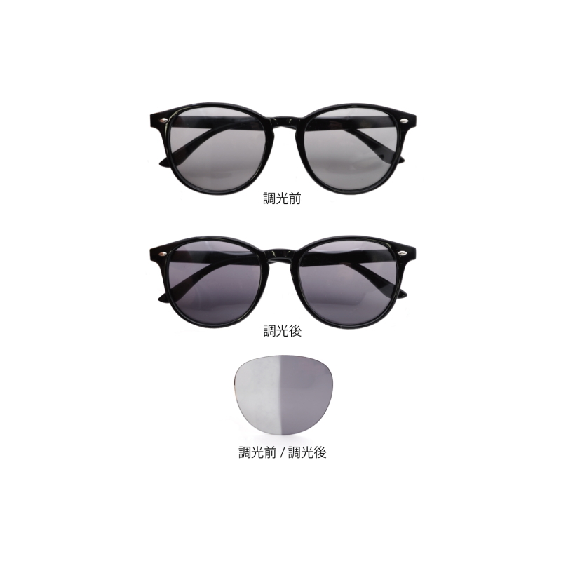 Frame : Black Lens : Grey 偏光・調光 偏光機能に加え、レンズに当たる紫外線の量によってレンズの色が変わる調光レンズを採用。 屋外ではレンズの色が概ね5分~10分程度で、グレーから少し濃いグレーに変わります。紫外線の少ない屋内に入るとこちらも概ね5分~10分程度で、少し濃いグレーが、元のグレーに戻ります。 ボストン型。バネ蝶番の採用で長時間掛けても耳周りが痛くなりにい。 ※メガネ拭き兼用超繊維巾着袋付き ※車内など、紫外線カットのガラスを使用しているため着色しない場合があります。 サイズ レンズ:縦 約45mm × 横 約55mm ブリッジ幅 約20mm テンプル長 約150mm フレーム全幅 145mm 可視光線透過率:40%~10% 紫外線透過率:0.1% |