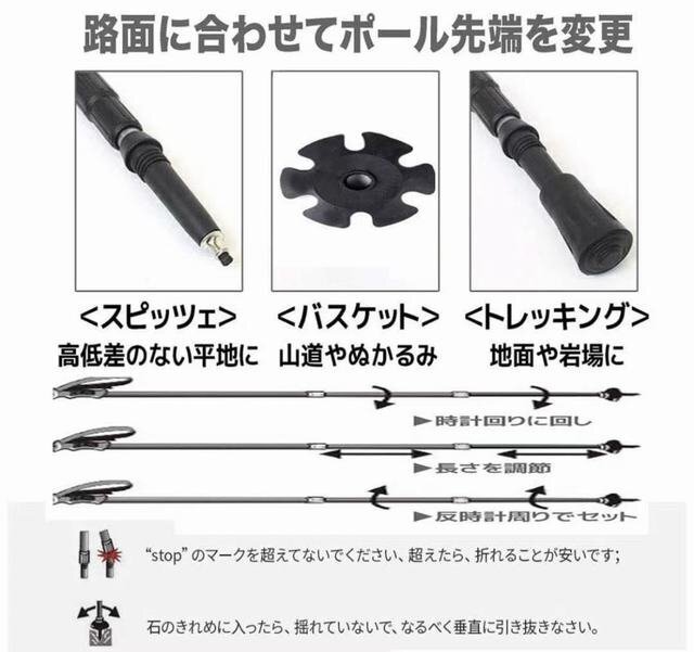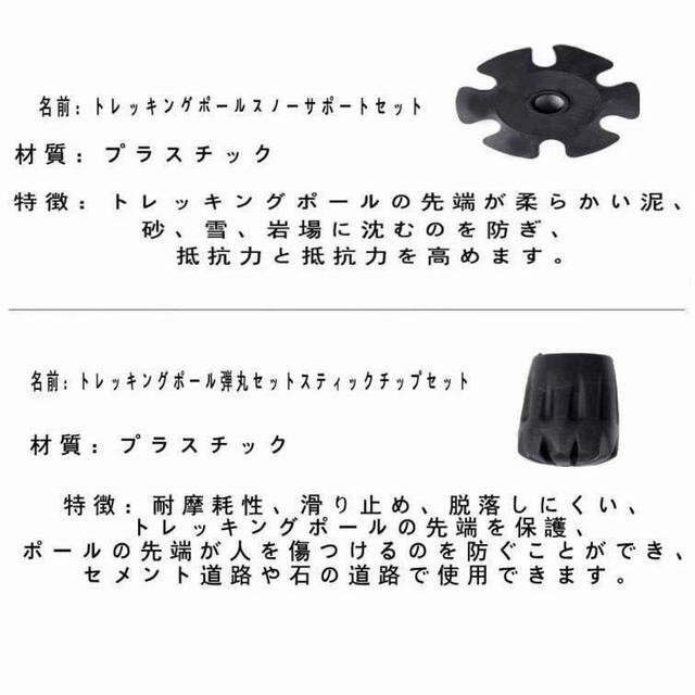 こちらのトレッキングポールの主な材料はアルミニウムで,軽量で丈夫です。 サイズ:収納時65cm 最大135cm 重さ:約300g(一本) (バスケットとプロテクター)EVA素材:EVA素材はよい防湿で、耐水性と耐食性、抗菌、無毒、無味だという長所を持っています。人間工学に基づくEVA取っ手は柔らかくて握り心地は快適です;幅広でソフトなストラップは長さ調節が可能、山登り、降り両方対応できます アンチショック機能つきなので,手首や腕への負担を軽減します。