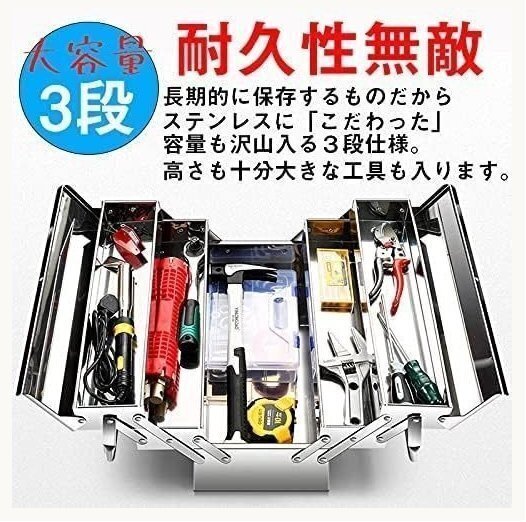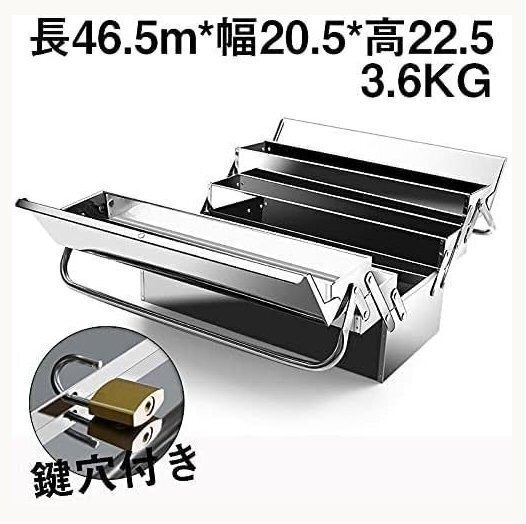 ※新品未使用寸法:幅465×奥行205×高さ225mm重量:約3.6kg重量: 3.6kg層数: 3層の折りたたみスペース高い耐久性をもつ、さびないステンレス工具箱です。大切な工具や道具、電動器具を安心して保管できます。持ち運びに便利な取っ手が両側に付いています。自動車鈑金等の金属