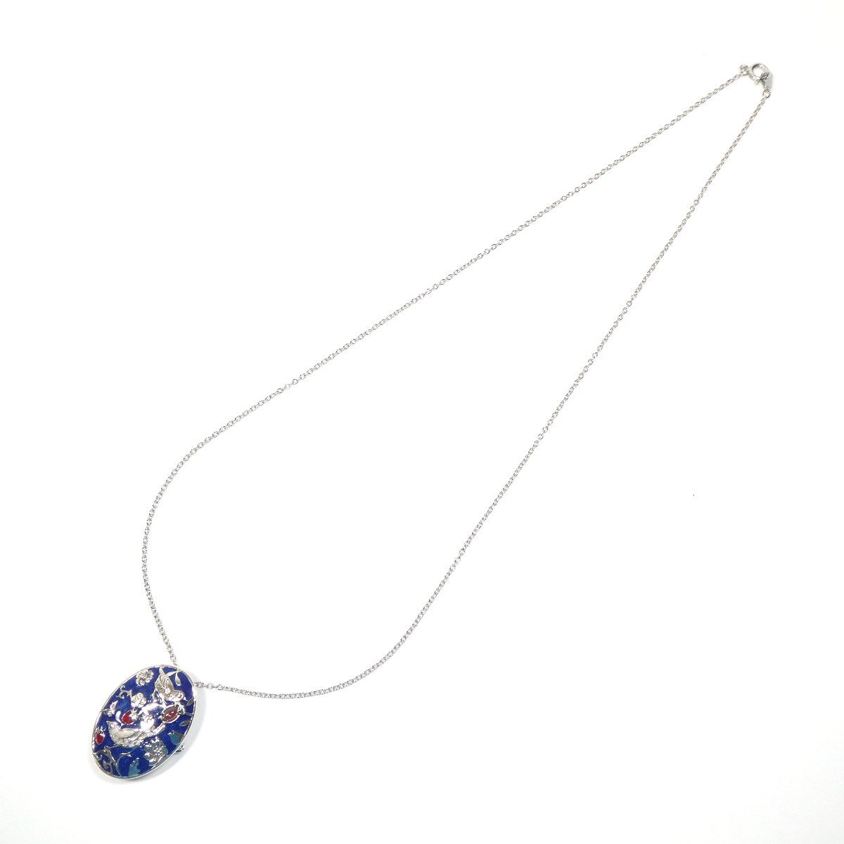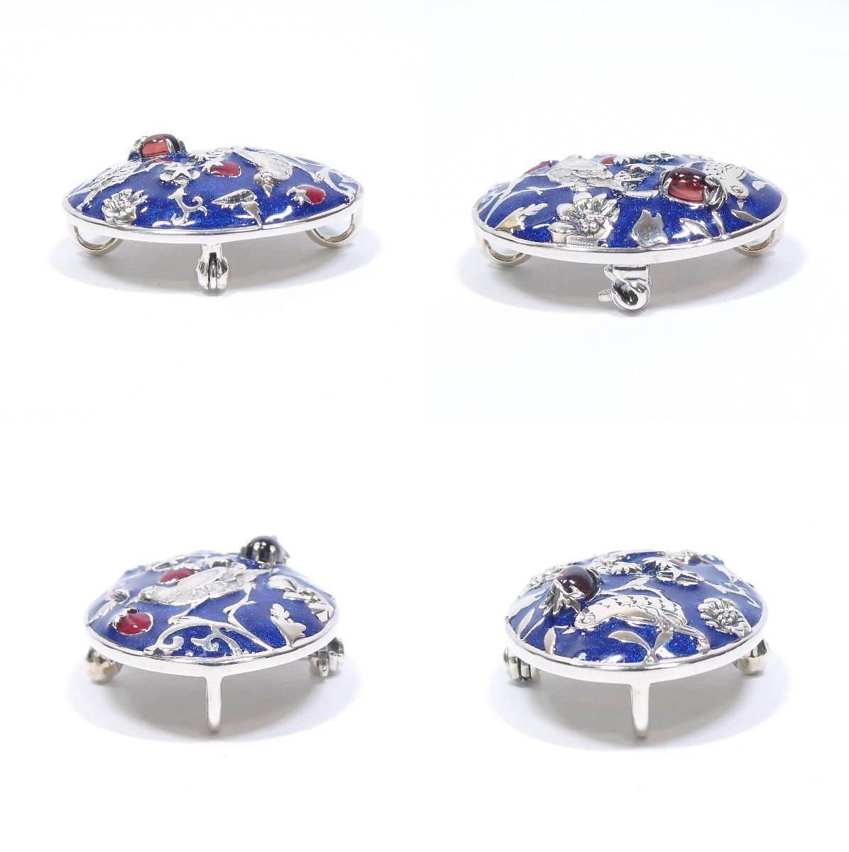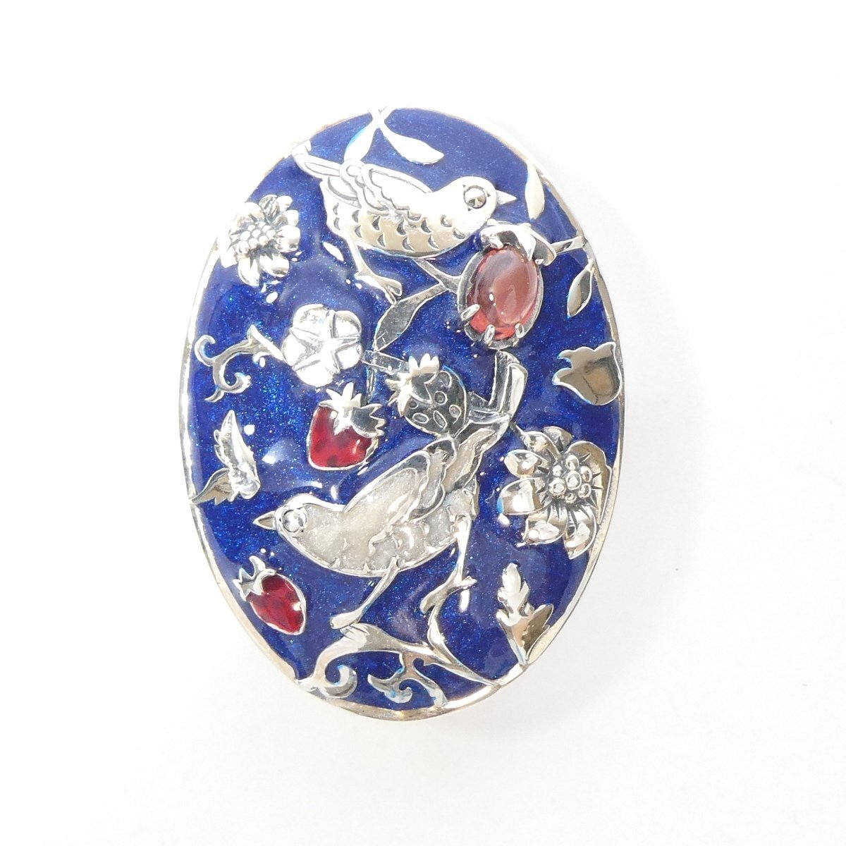 いちご泥棒のパターンの要となるイチゴ部分と鳥の部分にそれぞれ色にこだわったエナメルを、背景には深いブルーのエナメルを施し、一石留められたガーネットのカボションイチゴがアクセントとなった作品です。