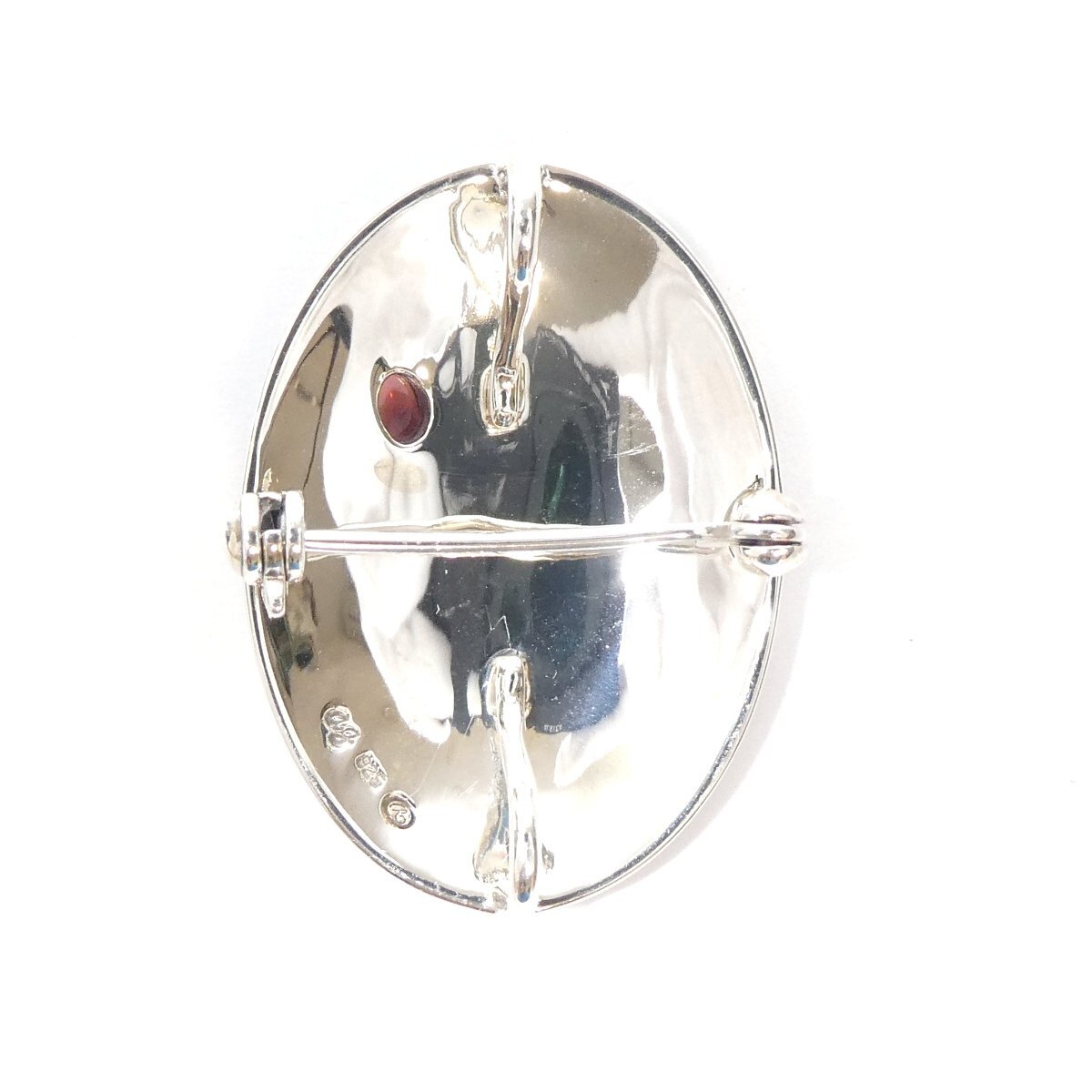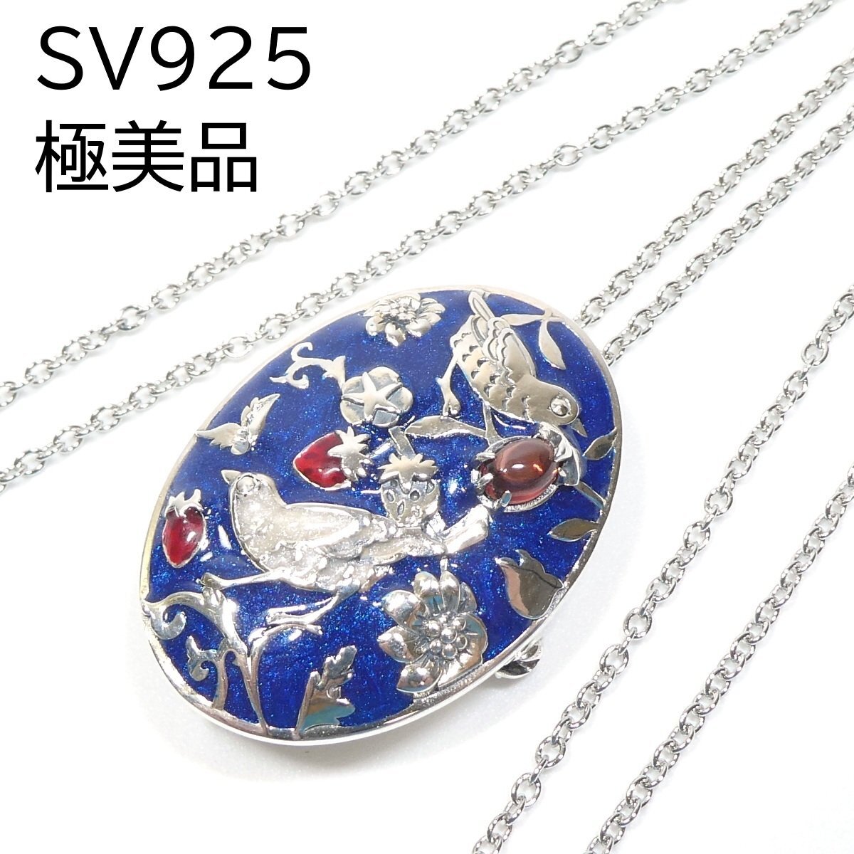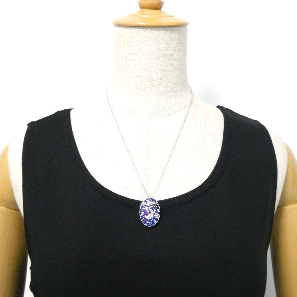 いちご泥棒のパターンの要となるイチゴ部分と鳥の部分にそれぞれ色にこだわったエナメルを、背景には深いブルーのエナメルを施し、一石留められたガーネットのカボションイチゴがアクセントとなった作品です。