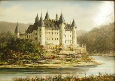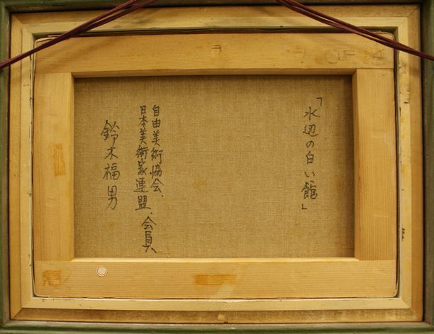 ・作者名:鈴木 福男 ・画題:水辺の白い館 ・技法:油彩画(原画)  (A1-HIO-R4-5-19-85.8)