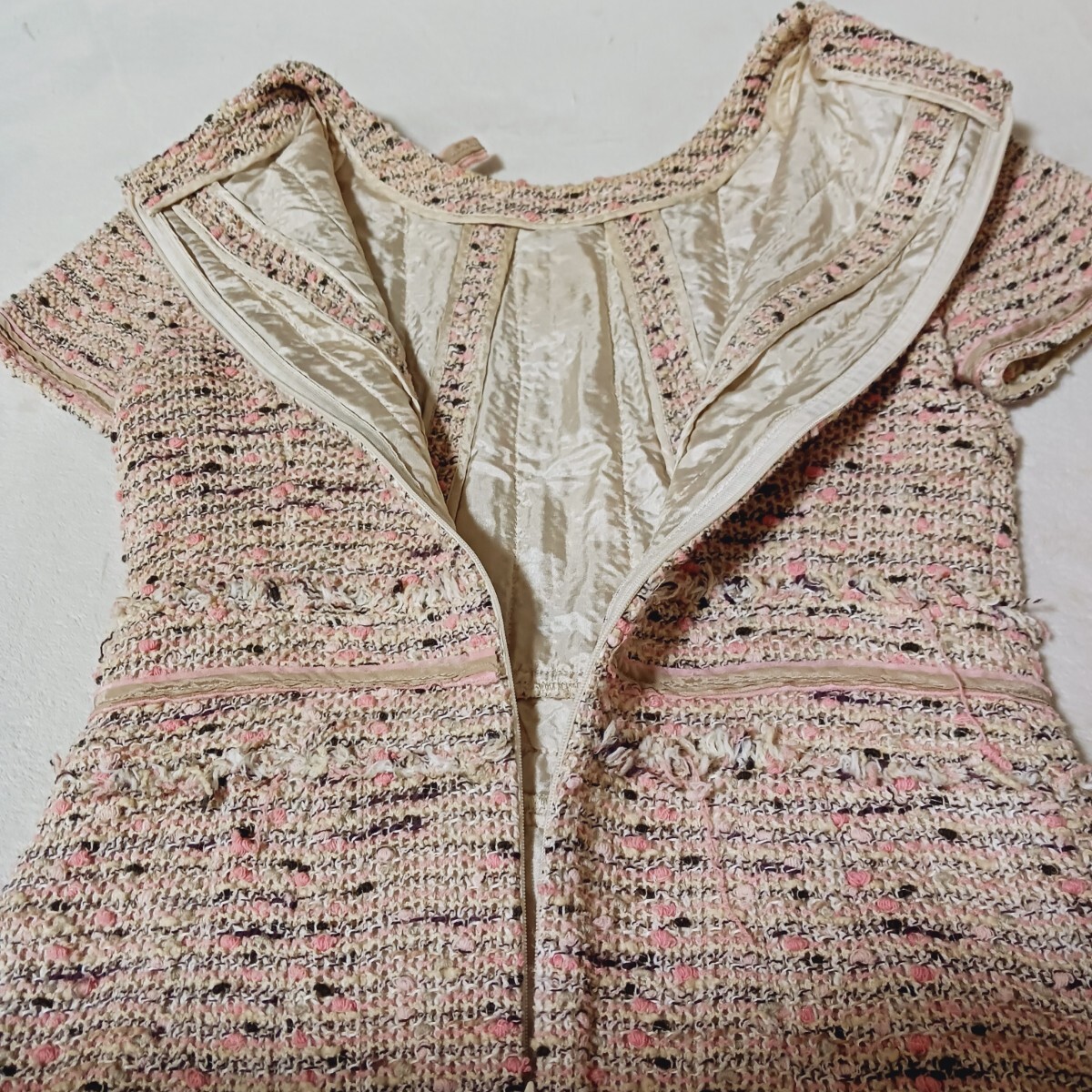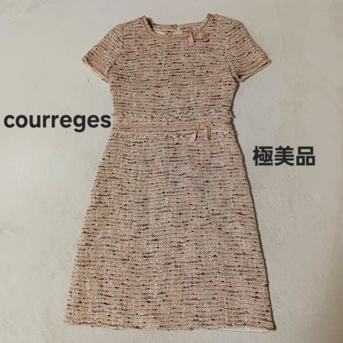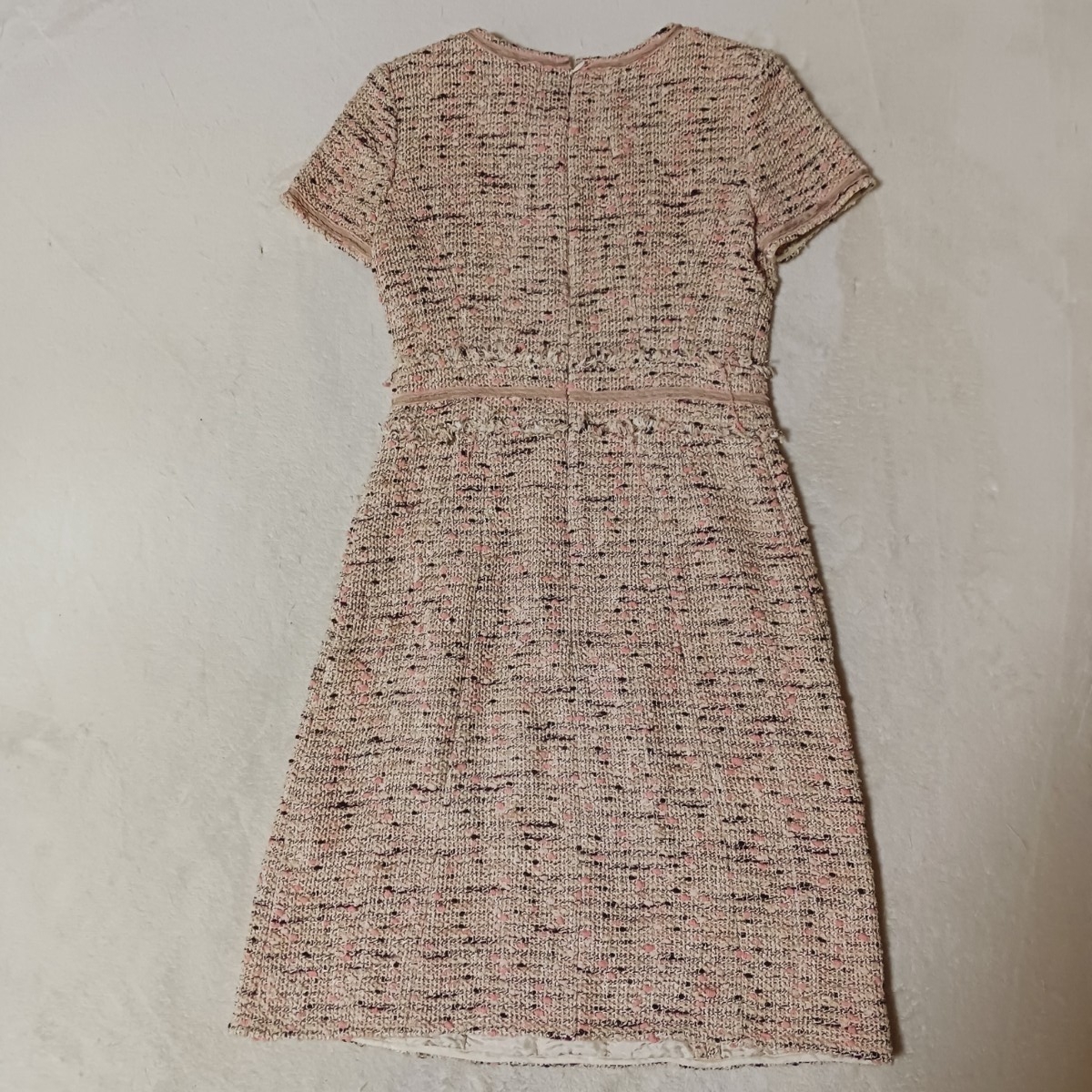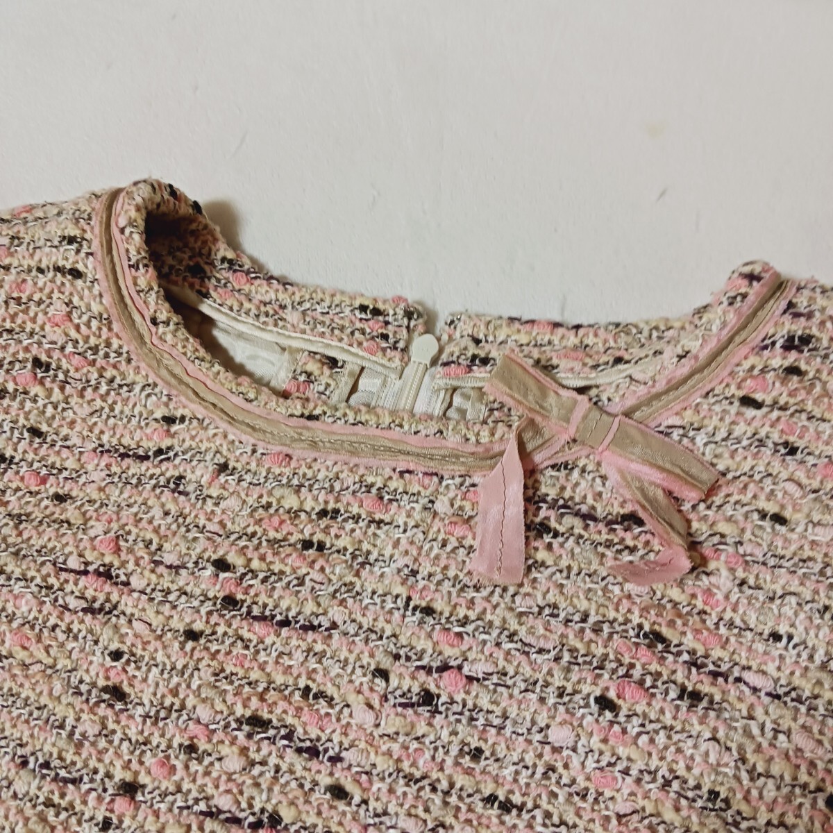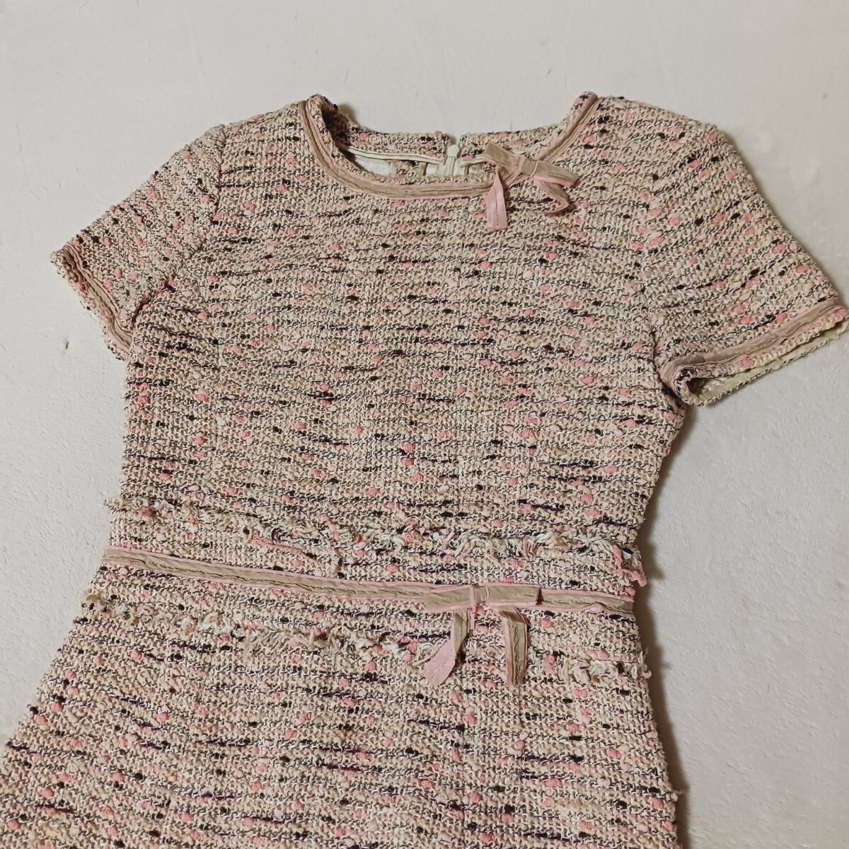 ツイード風のピンク系半袖ひざ丈ワンピース、リボン付きデザインが特徴。ロングワンピース Aライン タイトシルエット