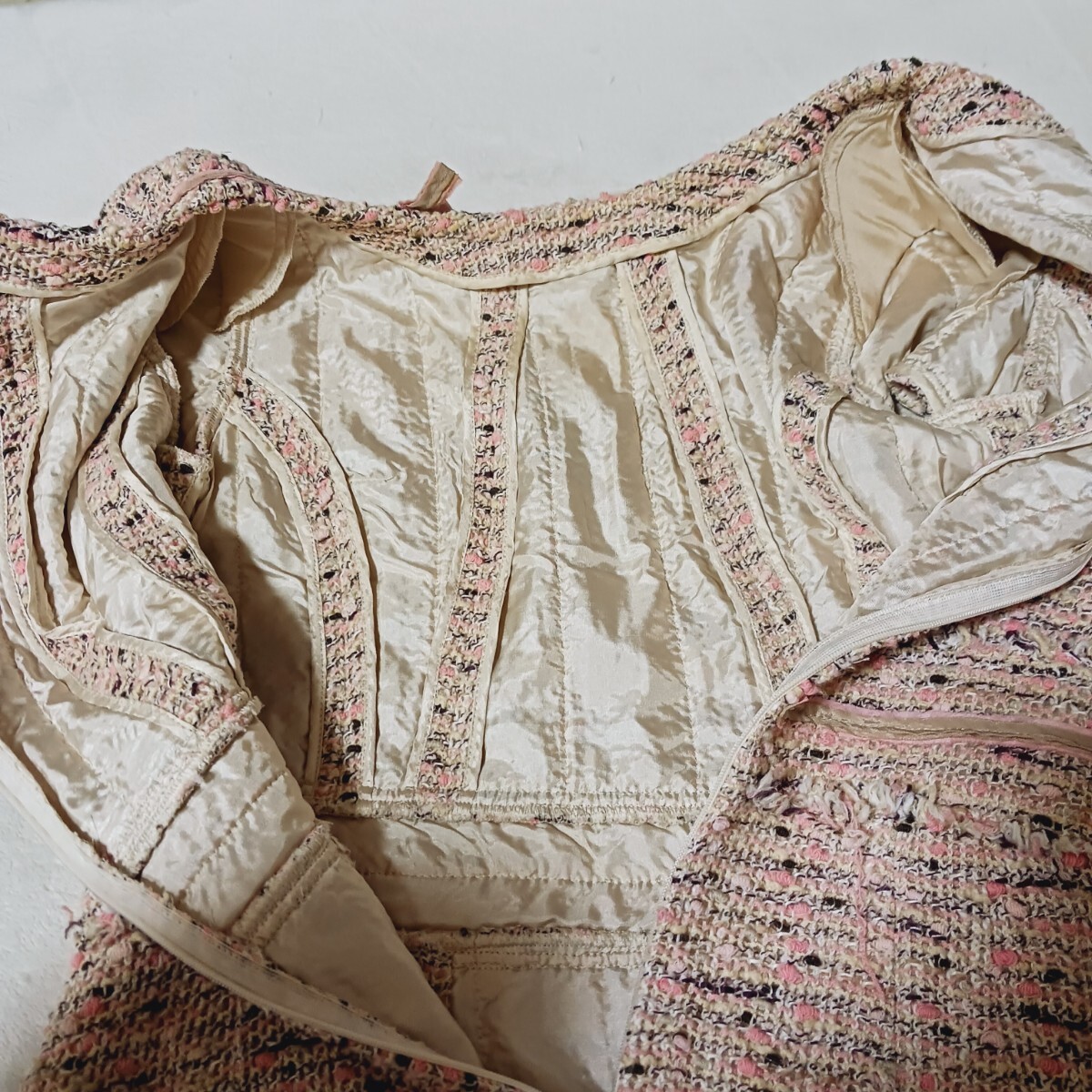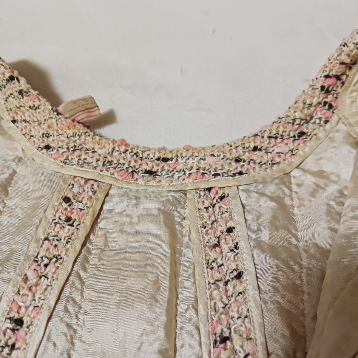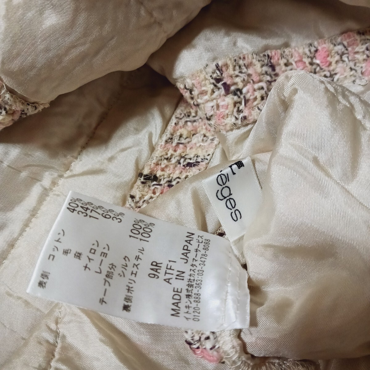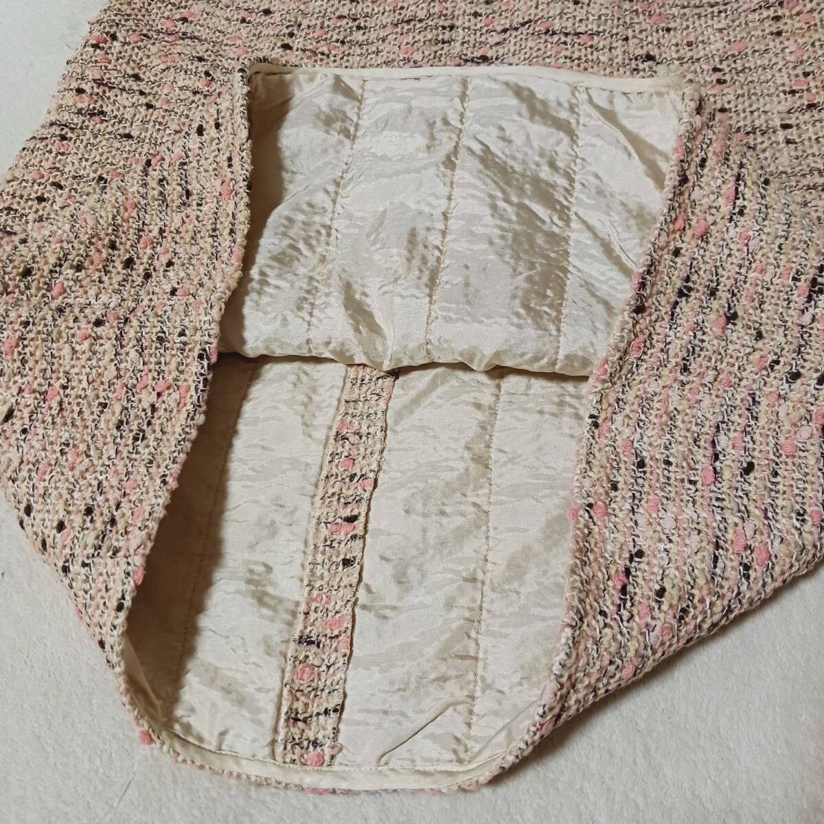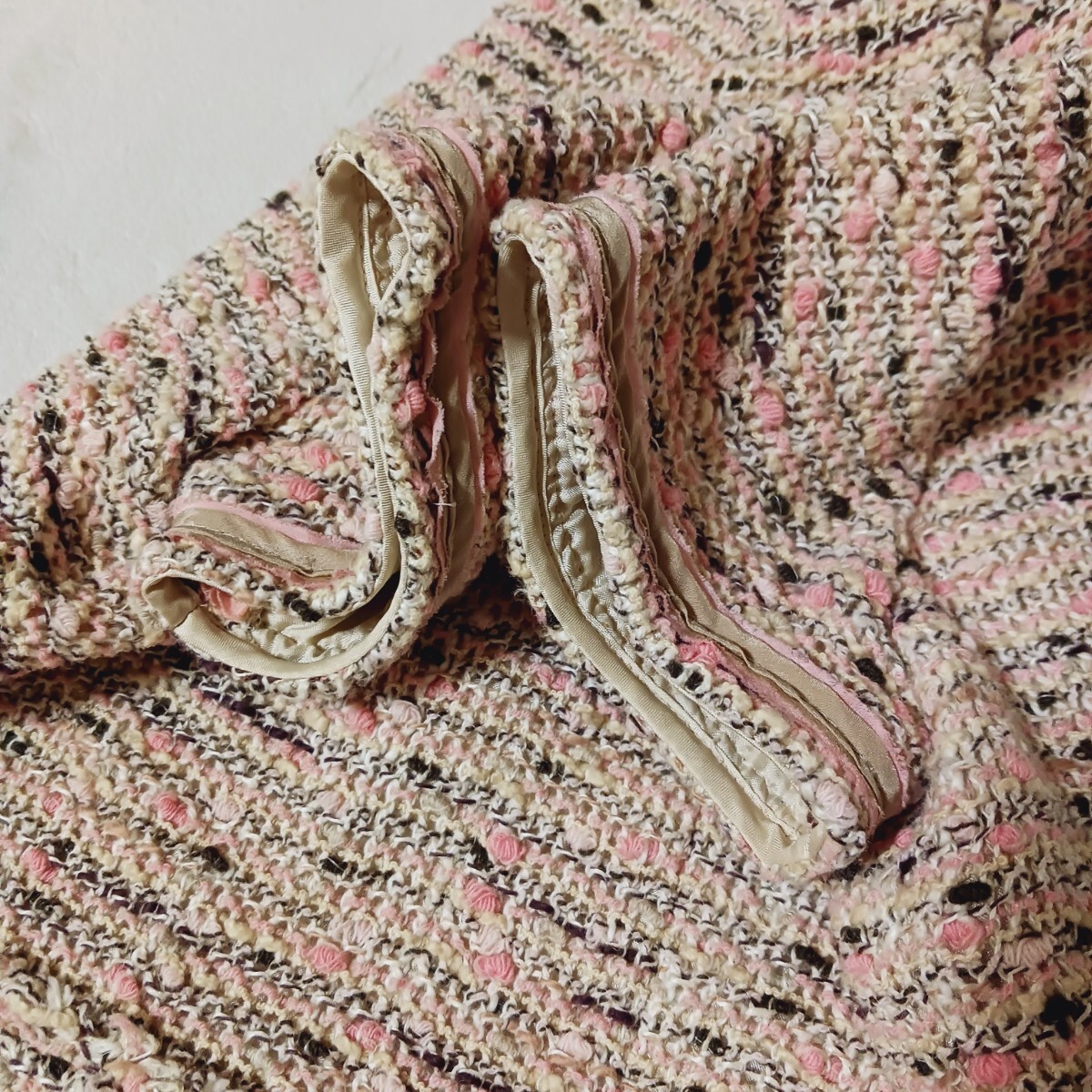 ツイード風のピンク系半袖ひざ丈ワンピース、リボン付きデザインが特徴。ロングワンピース Aライン タイトシルエット