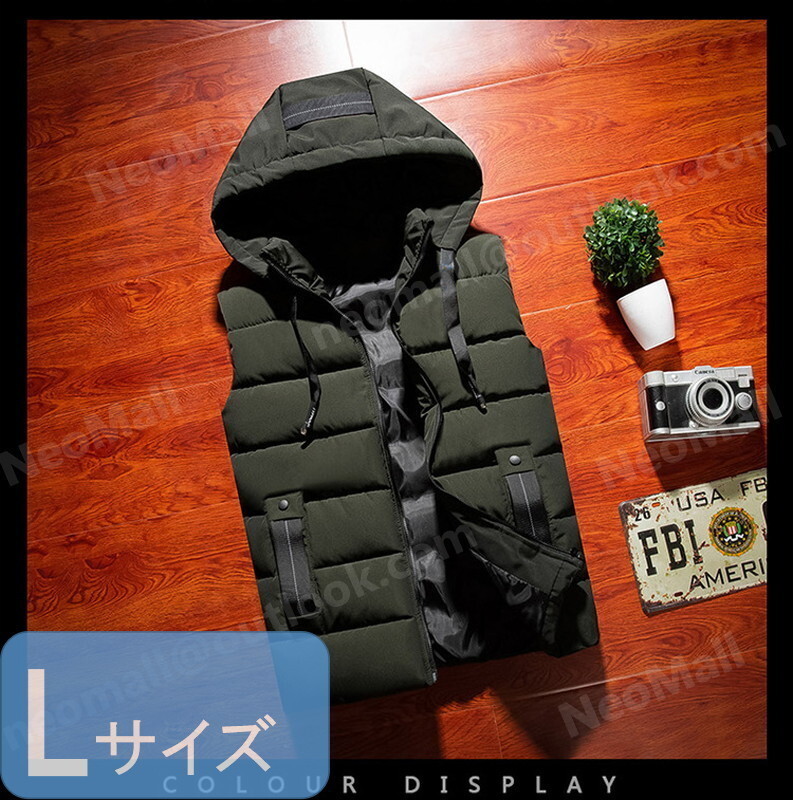 フードが外せる メンズ ダウンベスト 001 グリーン Lサイズ 中綿ダウン 中綿ベスト キルティング アウター 防寒 秋冬 暖かい