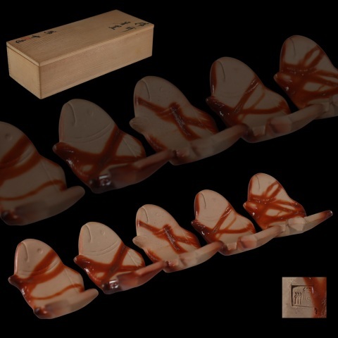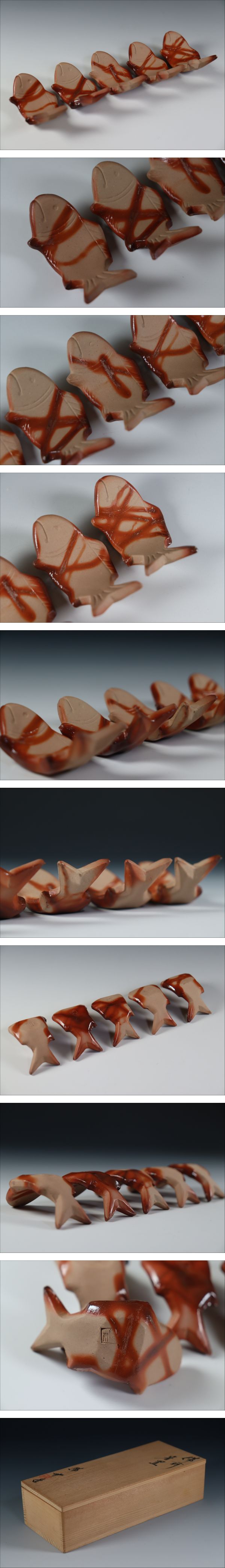 | 商品説明 | 商品名:蔵出し品 備前焼 備州窯 魚形 箸置 付属品:共箱あり。 サイズ:高さ2,7cm、横幅6,4cm、高台1,8cm。 状態:無傷になります。 |