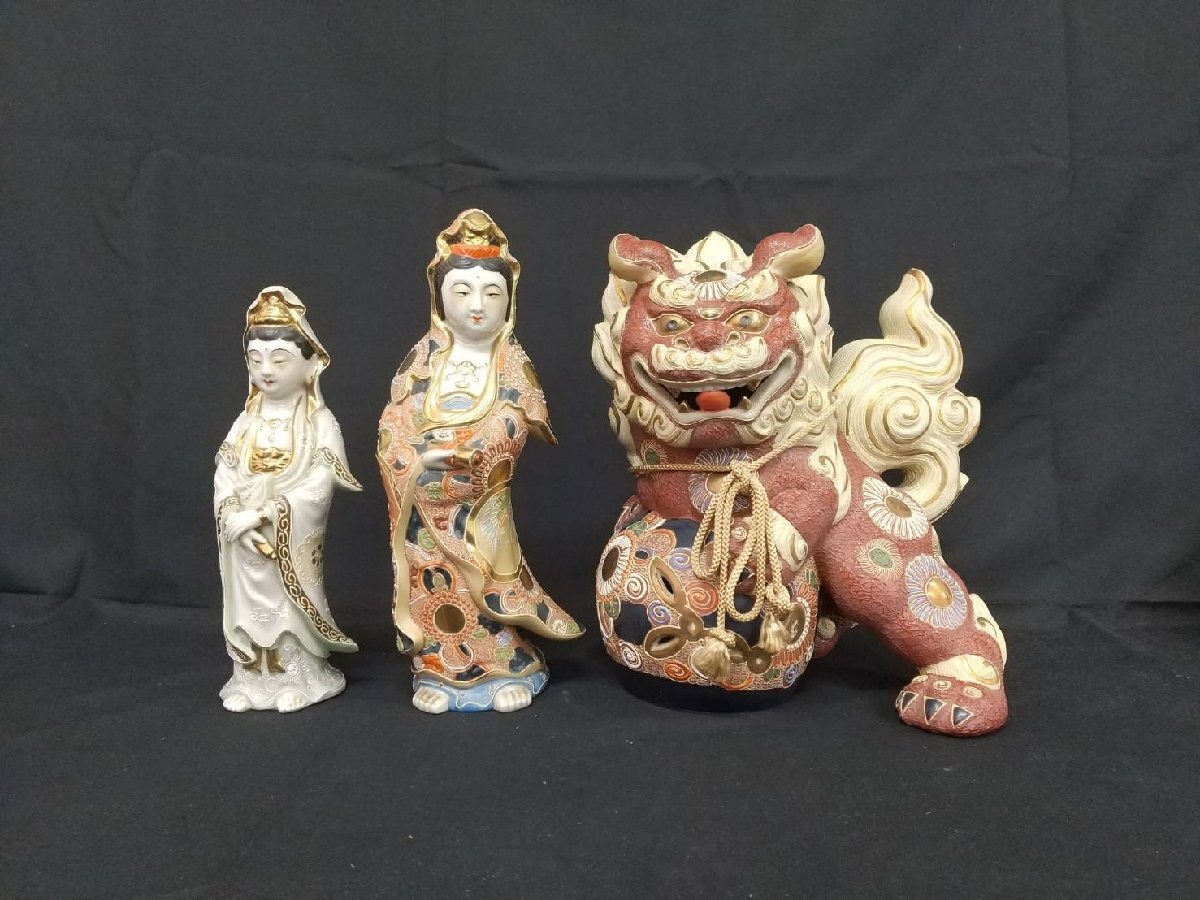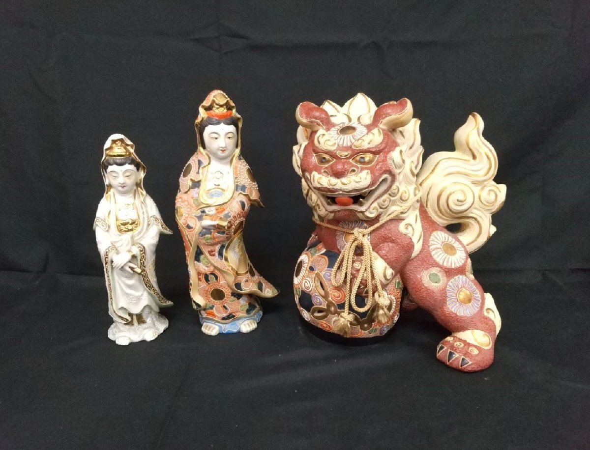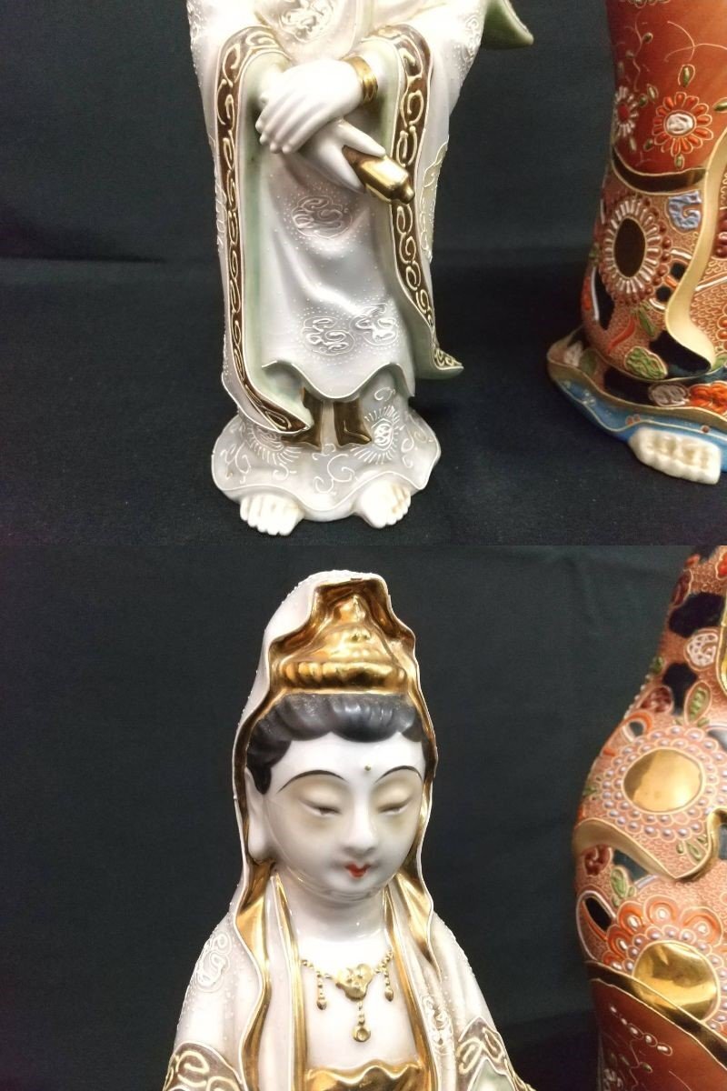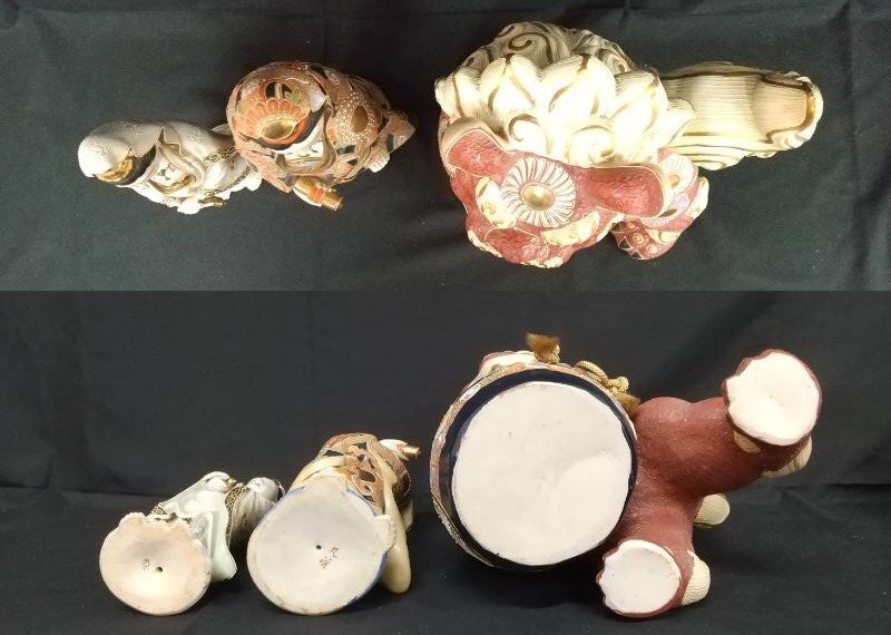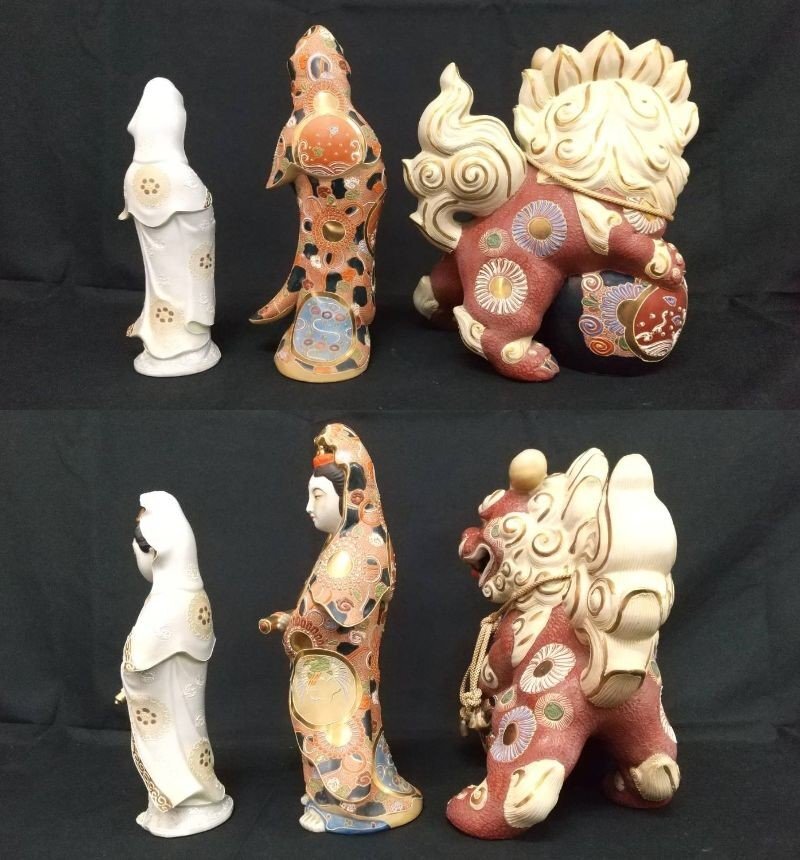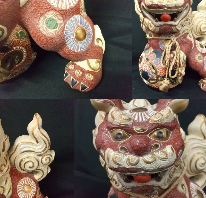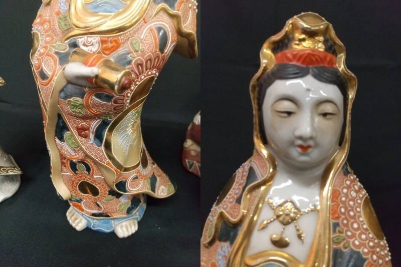 ご覧いただきありがとうございます。 九谷焼 まとめ 観音立像 観音像 八幡窯 玉乗獅子 金彩 色絵 玉獅子 赤獅子 置物 でございます。 画像に映っているものがすべてでございます。 ■寸法 観音像:7×6.5cm 高さ25.5cm 観音像:11×10.5cm 高さ30cm 玉乗獅子:24×17cm 高さ28cm ※素人採寸の為、多少誤差が生じる場合がございます。 ■状態 経年による擦れや傷、汚れ等ございます。 その他詳細は画像にてご確認下さいませ。 現状渡しとなります。 未確認箇所の不具合を理由とする返品・値引き交渉 には 応じかねますのでご理解ご了承頂いた上でのご入札を 宜しくお願い致します。 ●陶器製品の場合は、製造段階(焼成時)に出来る窯傷や貫入等がある場合もございます。 ●骨董品・預かり品の代理出品等ありますのでご理解下さい。 鑑定を受けた物、本物保証できるものにつきましては明記しております。 それ以外については未鑑定品、真贋保証はございません。 ●古物出品の為、全て漏らさず情報を掲載することは困難でございます。 あくまで自己責任で入札にご参加いただきますようお願い致します。 ●時代、作家名、状態、材質等は個人の見解によるものです。 主観に基づくものであり、確定するものではありません。 よって画像や説明文以外にも、汚れ、スレなど経年損傷があることを前提の 入札とし、与えられた画像と説明文より入札者の見識による総合的な価値 判断に基づいて入札されたものであると判断致します。 その為、万が一掲載画像と説明文の情報の遺漏、誤記があった場合において も入札後及び商品受取後にその点を事由とした入札の取消、返品、返金は お受けできません。 予めご了承下さい。 ●タイトル、商品説明欄に「保証」と記載された物で 個人的見解を除き、 公的に認められた所定鑑定人及び機関の鑑定により贋作と判明した場合は、 落札代金、送料とも全額ご返金致します。 但し、その際の返金は落札金額と送料のみで鑑定料及びそれに伴う経費は 負担出来かねます。 ●素人採寸の為、重さ、採寸の違いによる返品はお受け致しかねます。 使用、清掃後の返品、返金も固くお断りさせて頂きます。 以上の点、ご了承の上ご入札の程宜しくお願い致します。 |