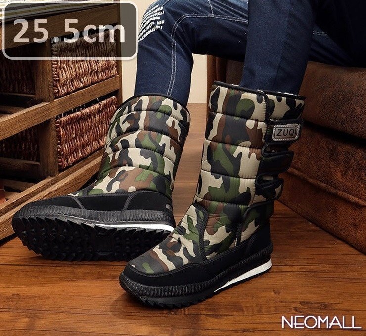 メンズ スノーシューズ 【866】 25.5cm グリーン迷彩 ムートンブーツ スニーカー ウィンターブーツ 裏起毛 防水 防寒 防滑 冬用靴 綿靴