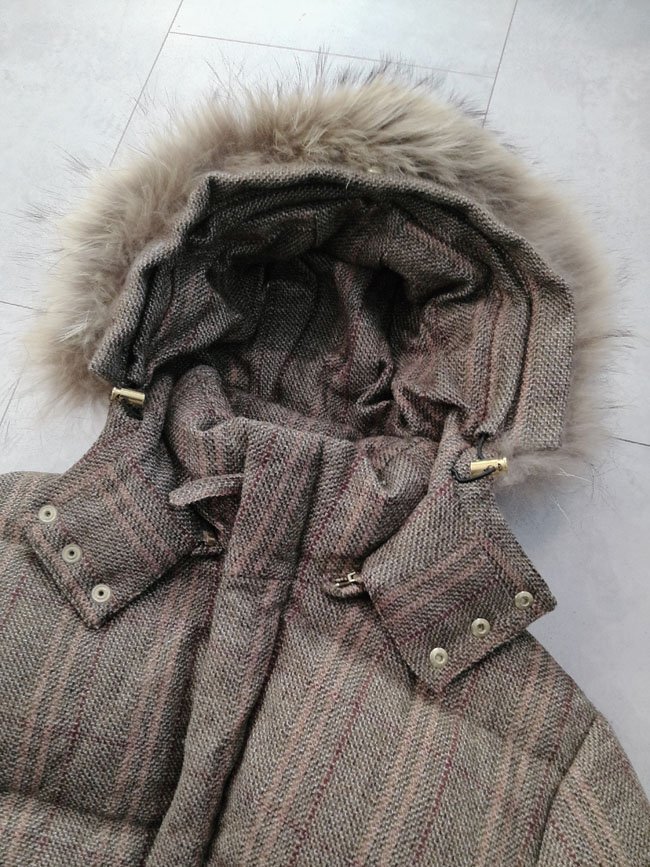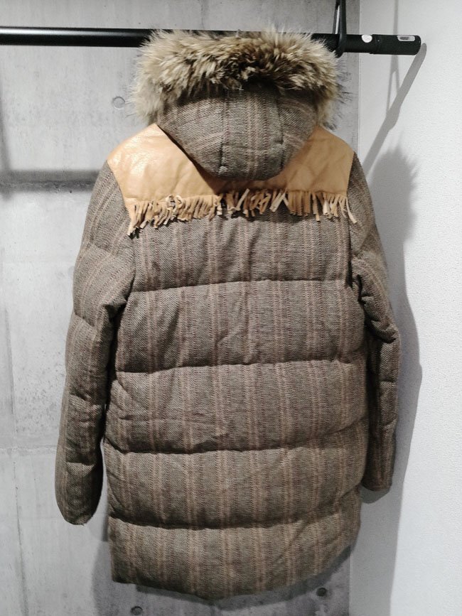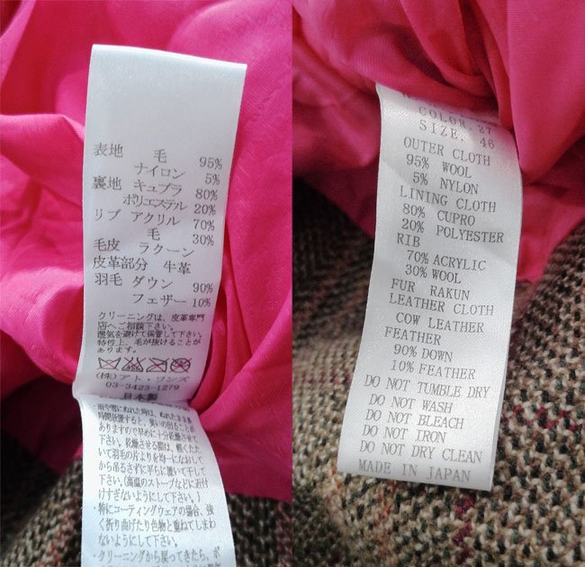 | 材質 | 表地/毛 95% ナイロン 5% 裏地/キュプラ 80% ポリエステル 20% リブ/アクリル 70% 毛 30% 毛皮、皮革部分/ラクーン、牛革 羽毛/ダウン 90% フェザー 10% |