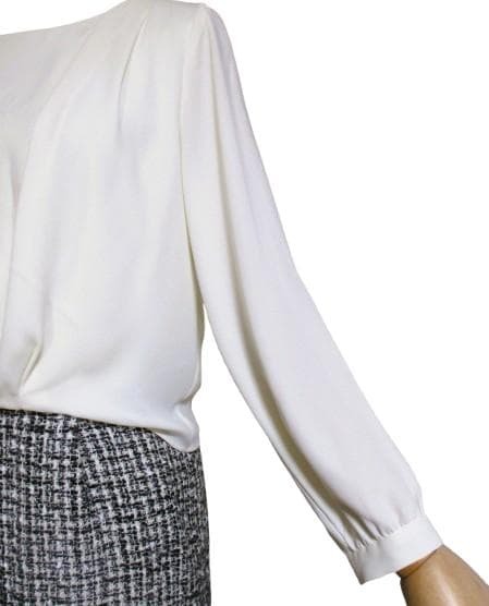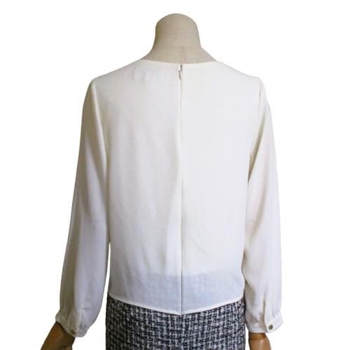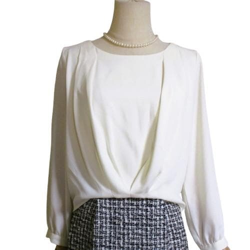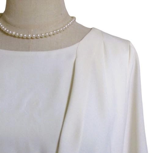 グリーンレーベルリラクシングのオフホワイトのブラウスをタイトスカートにフロントインしたようなデザインのセレモニーシーンや通勤に着回せるコンビワンピース