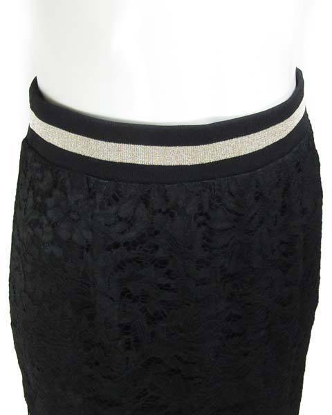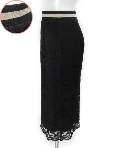| 総レースのエレガントなスカート。薄手の生地で春夏シーズンにおすすめです。ウエストにはゴールドのラインが入っていてトップスのインにもアウトにもできるデザインです。ビジネスシーンからオフの日までお使い頂けます。 |